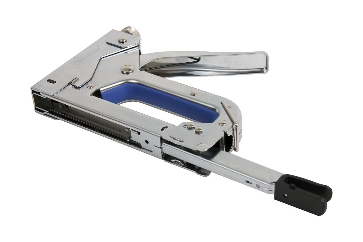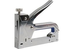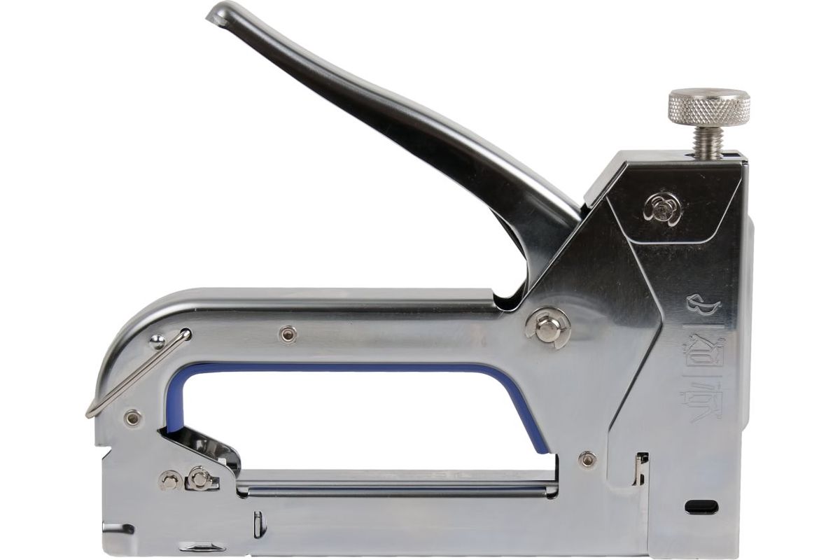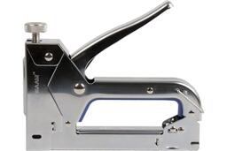 Профессиональный пружинный степлер для забивания скоб. Выполнен в стальном корпусе, с верхним регулятором удара.