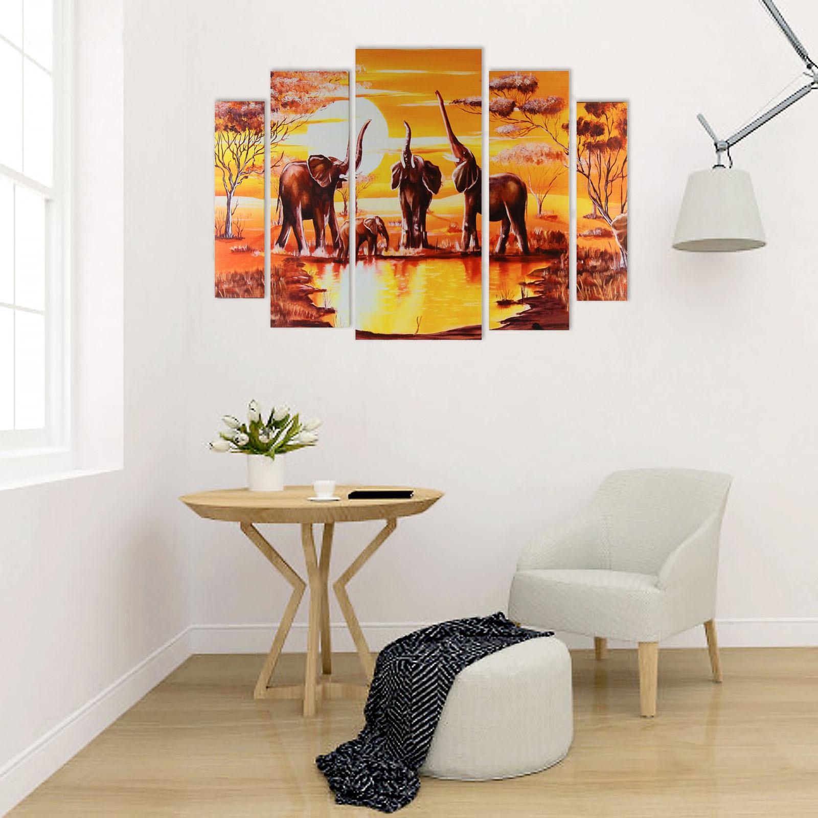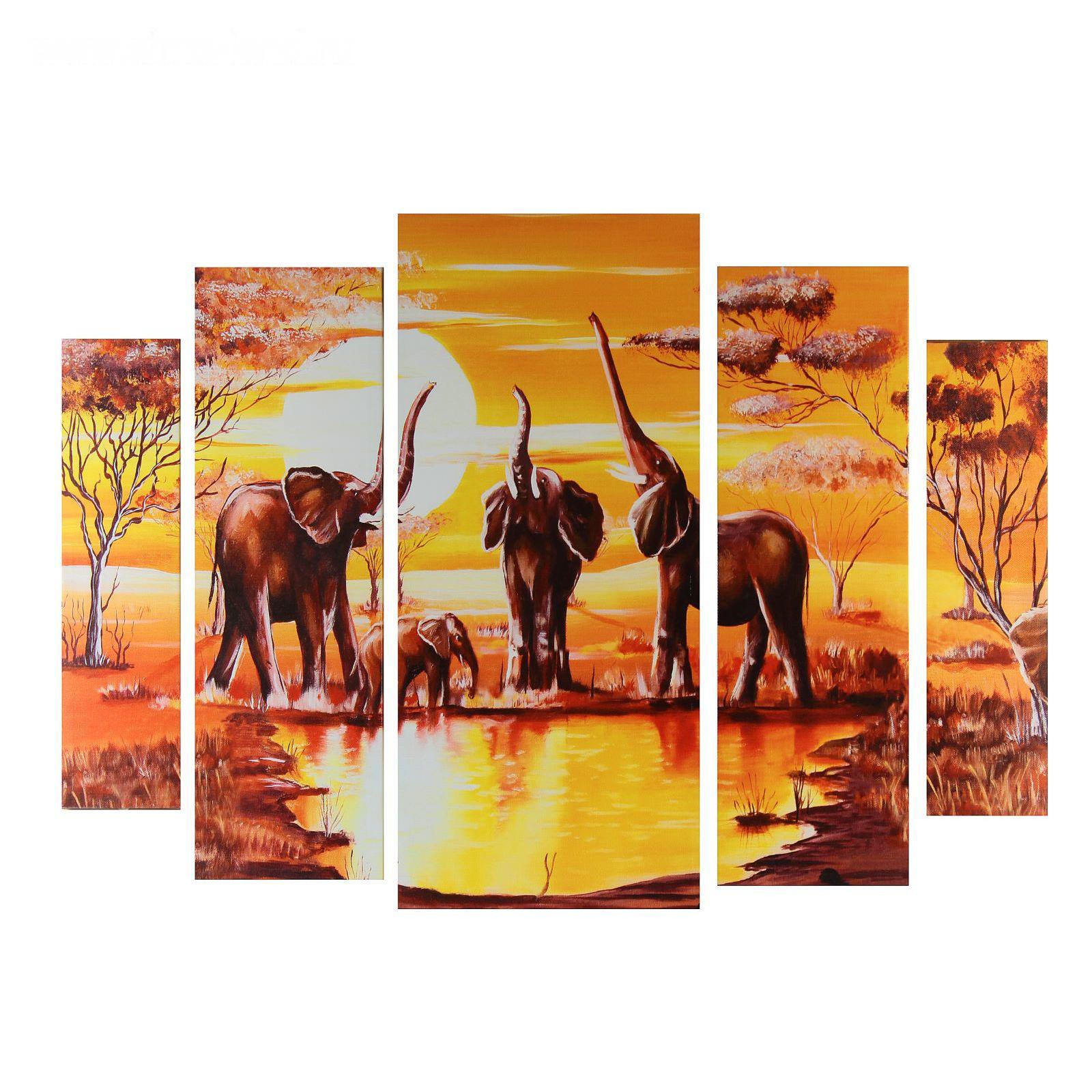 Картина модульная на подрамнике "Слоны на водопое" 2-14х53, 2-21х69,5 1-34х79; 80х118см