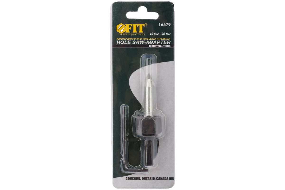 С центрирующим сверлом. Для круговых пил FIT 16561 -16575. в комплекте ключ «Hex» 2,5 мм. Адаптер с центрирующим сверлом FIT 16579 предназначен для кольцевых коронок по кафелю FIT арт. 16561-16565 диаметром от 19 мм до 32 мм. Применяется для крепления коронки в патроне дрели.