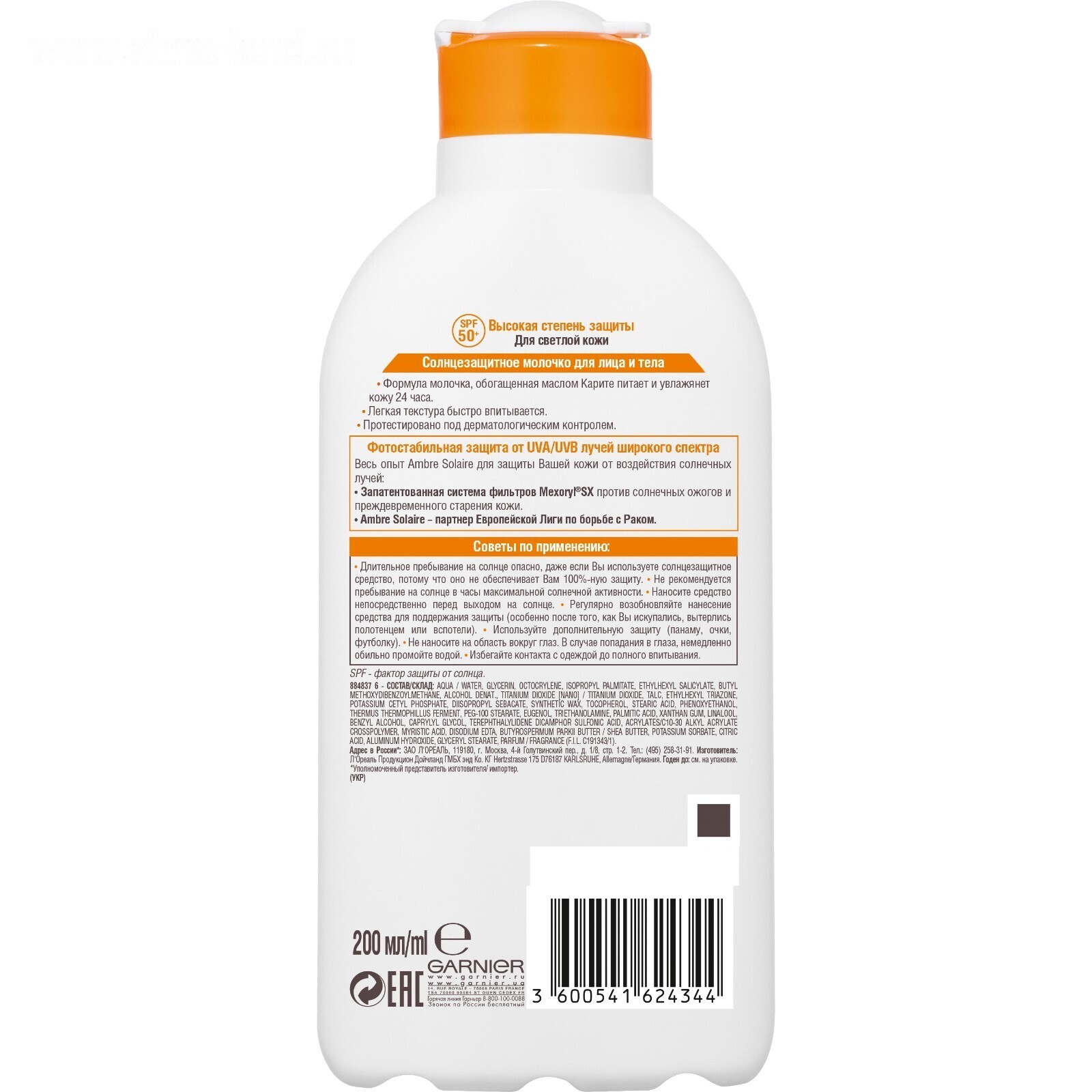 Солнцезащитное молочко для лица и тела Garnier Ambre Solaire, Spf 50+, водостойкое, нежирное, с карите, 200 мл