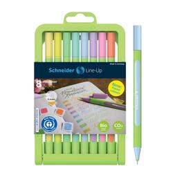 Набор капиллярных ручек Schneider Line-Up пастельных тонов. В наборе 8 капиллярных ручек ванильного, лаймового, мятного, бирюзового, голубого, сиреневого, розового и абрикосового цвета. Цвет колпачка соответствует цвету чернил. Диаметр пишущего узла ручки составляет 0,4 мм, толщина линии письма 0,4 мм. Эргономичный трехгранный прорезиненный салатовый корпус. Упакованы в пластиковый пенал-подставку с европодвесом. Данный продукт имеет сертификат экологической безопасности "Blue Angel"