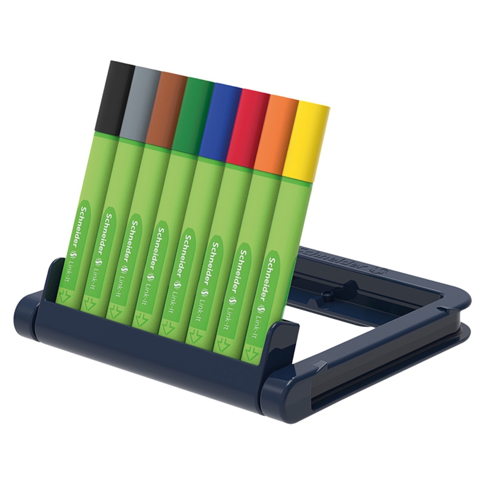 Можно комбинировать с фломастерами серии Link-It. В наборе 8 капиллярных ручек: синего, чёрного, красного, зелёного,серого, светло-коричневого, оранжевого и жёлтого цвета. Упакованы в удобный пластиковый футляр-подставку с европодвесом. Письменные принадлежности Schneider разрабатываются и производятся только в Германии.