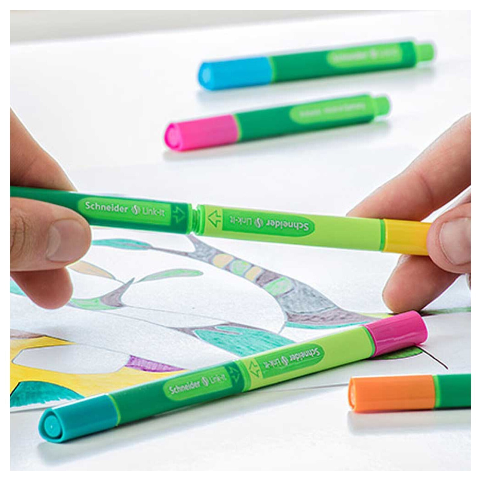 Набор капиллярных ручек Schneider Link-It в ярком дизайне. Капиллярные ручки предназначены для письма, рисования, раскрашивания и черчения. Диаметр пишущего узла ручки составляет 0,4 мм, толщина линии письма – 0,4 мм. Эргономичный трехгранный прорезиненный салатовый корпус. Цвет колпачка соответствует цвету чернил. Уникальная модульная система Click! позволяет соединить две половины ручки в одно целое