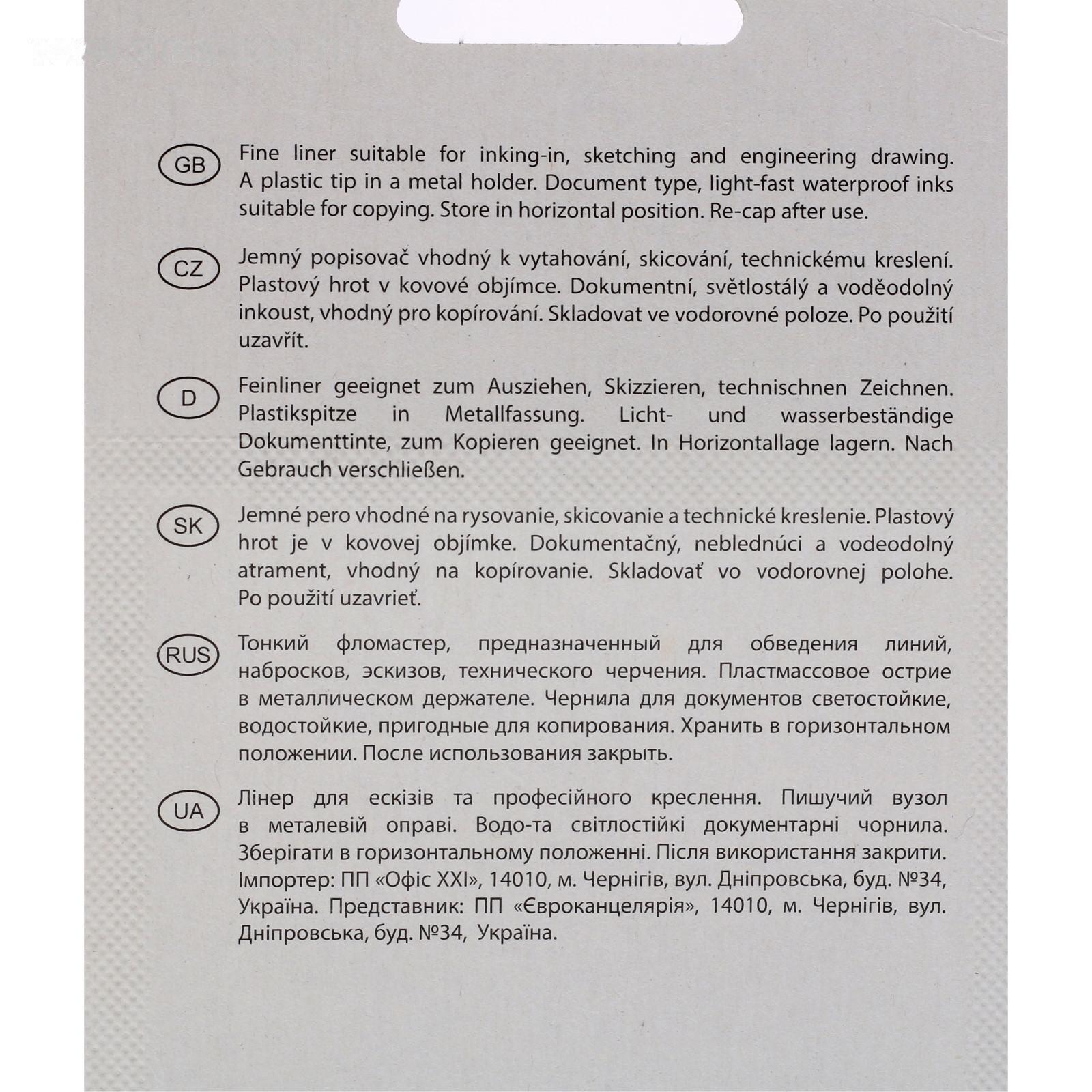 Капиллярные (линеры) ручки с эргономичным дизайном, невысыхающие чернила (не высыхают до 14 дней без колпачка). Пластмассовый пишущий узел, устойчивый к нажиму. Длина линии - 1 500 м.