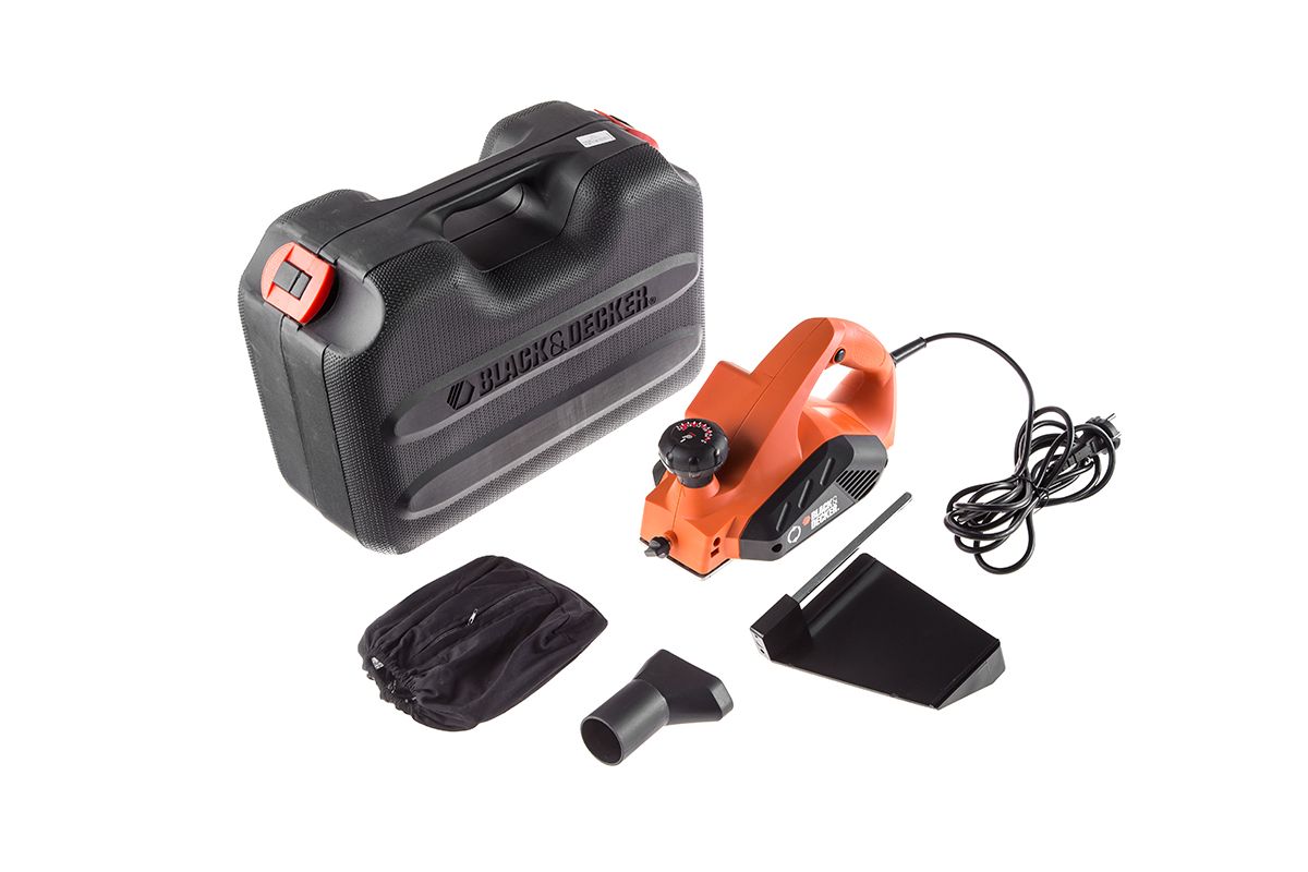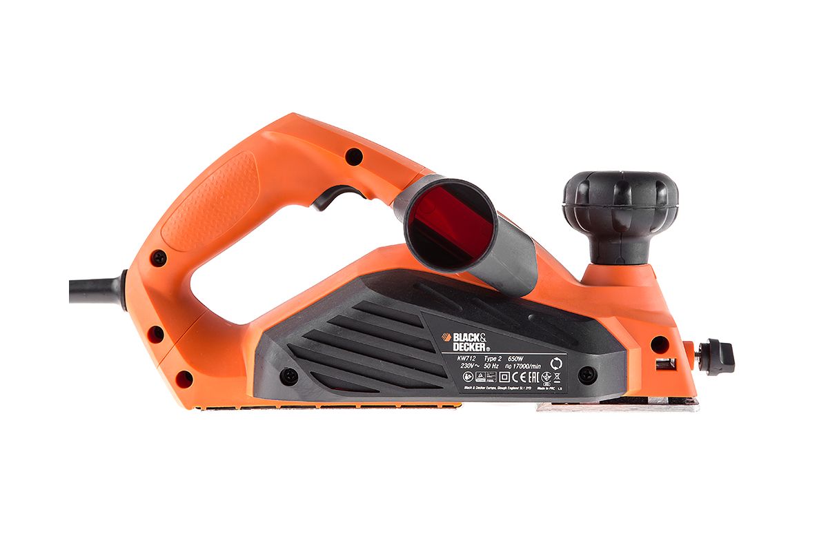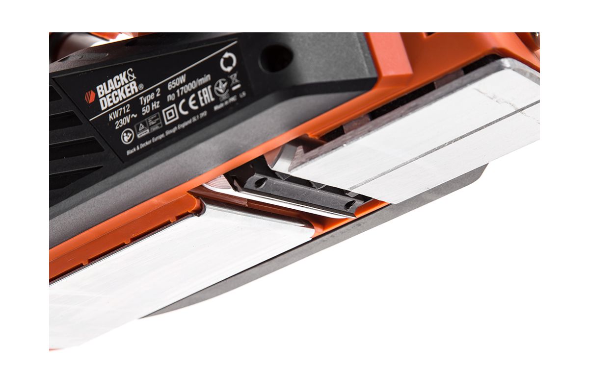 BLACK & DECKER KW712KA — электрорубанок для непродолжительных работ с параллельной направляющей и кейсом. Мощность — 650 Вт; ширина лезвия — 82 мм; толщина стружки — 2 мм; фальцевание — до 8 мм. Особенности: регулируемая глубина строгания; двусторонние твердосплавные ножи; пылеотвод; V-образная канавка.