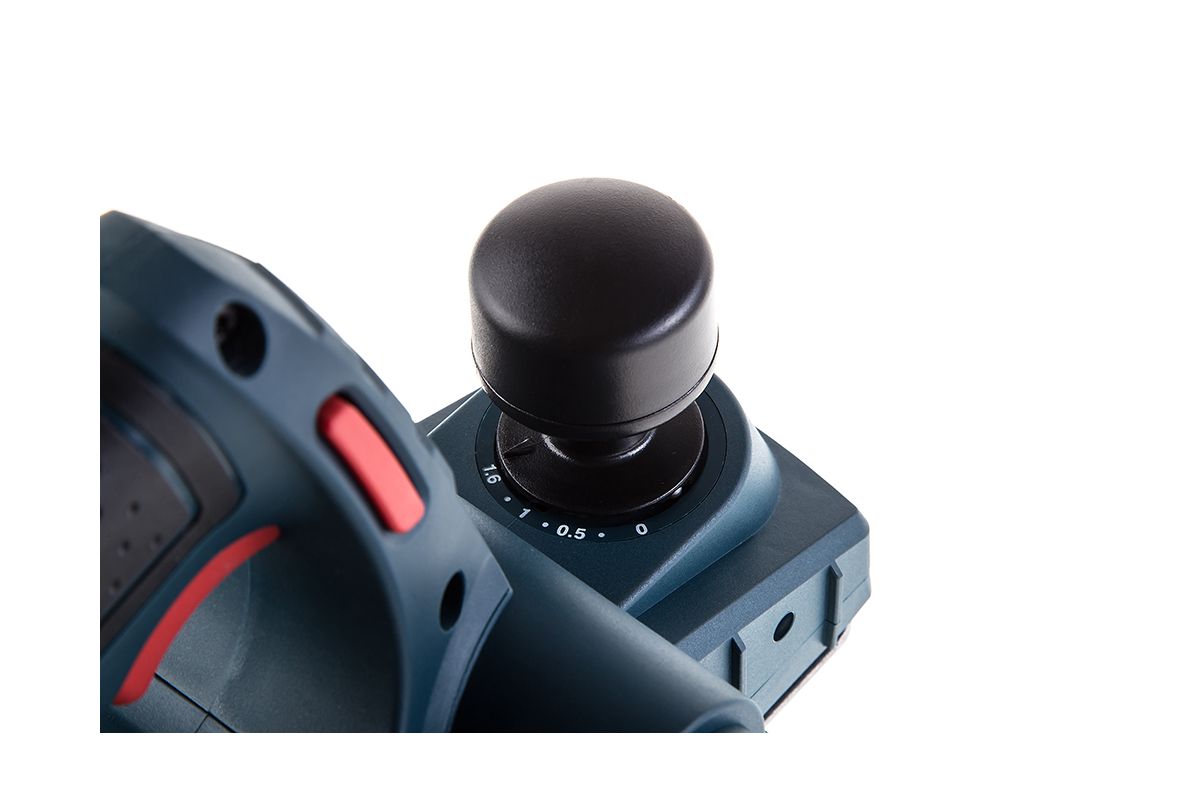 Дополнительная рукоятка облегчает управление и настраивает глубину строгания. Максимальная глубина снятия древесины за один проход – 1,6 мм.