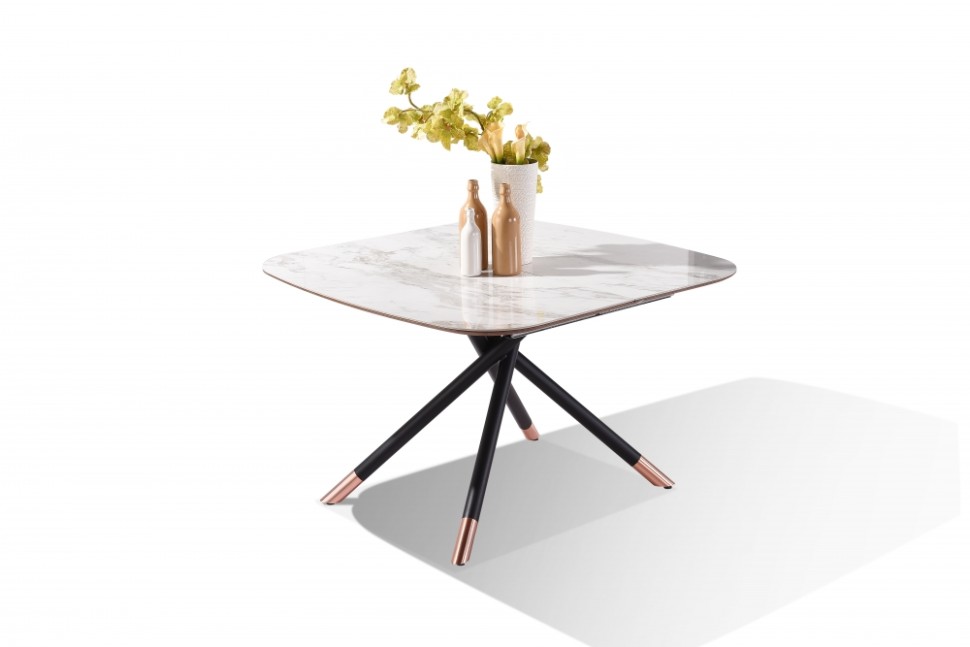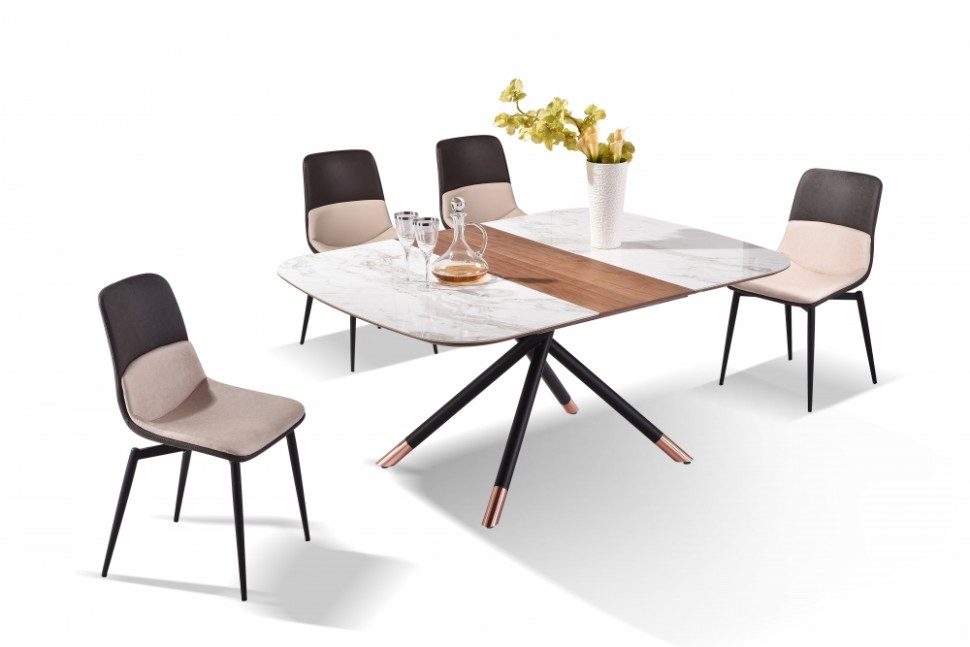 Обеденный стол с раздвижной конструкцией и металлическими ножками — эксклюзивная модель, которая станет центром притяжения вашей кухни. Стол-трансформер —его деревянная часть легко задвигается, оставляя сплошное мраморное покрытие. Отличный вариант для небольших пространств, где бывает много гостей – с этим столом вы будете спокойны, что все близкие поместятся за одним столом и вы здорово проведете время. Боковые части покрыты керамикой, средняя часть — шпоном грецкого ореха. Стол выглядит благородно и элегантно. Вы будете получать удовольствие от этого дизайна, а все гости будут восхищаться им. Необычная прямоугольная форма смотрится свежо и ярко. Такая форма сейчас пользуется особой популярностью, затмевая собой привычный круг. Собираться всей семьей за этим столом удобно и комфортно. А благодаря закругленным уголкам, стол подойдет в те дома, где есть маленькие дети. Резиновая заглушка на ножках надежно фиксирует стол и удерживает на месте, не царапая поверхность. Можно не беспокоиться о том, что мебель повредит пол или сдвинется с места.