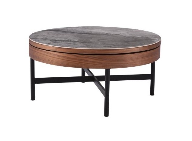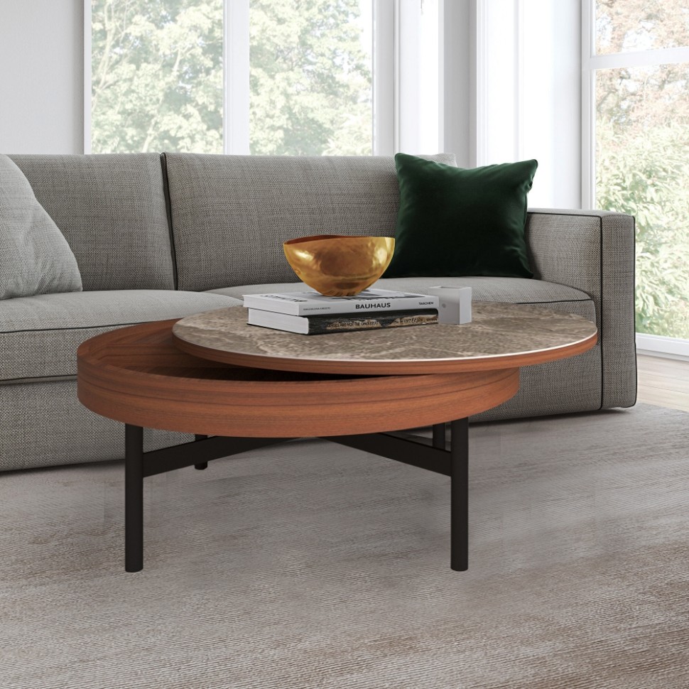 Журнальный столик с встроенным местом для хранения, с покрытием столешницы под мрамор и металлическими ножками. Столешница покрыта слоем спеченного камня. Такой материал устойчив и долговечен. Вы можете поставить любые предметы на этот стол, зная, что он сохранит свою первоначальную форму. Столешница стола имеет место для хранения. В стол вы можете положить приборы, полотенца – все что угодно. Отличный вариант для любителей скрытых систем хранения и небольших пространств, где хочется вместить все, что нужно для жизни. Столешница окрашена под темный мрамор – это роскошная поверхность, которая придает теплоту и изысканность любому интерьеру. Каждый рисунок на камне — совершенно удивительная история, и нет ни одного друг на друга похожего. Идеален для акцентов в интерьере.