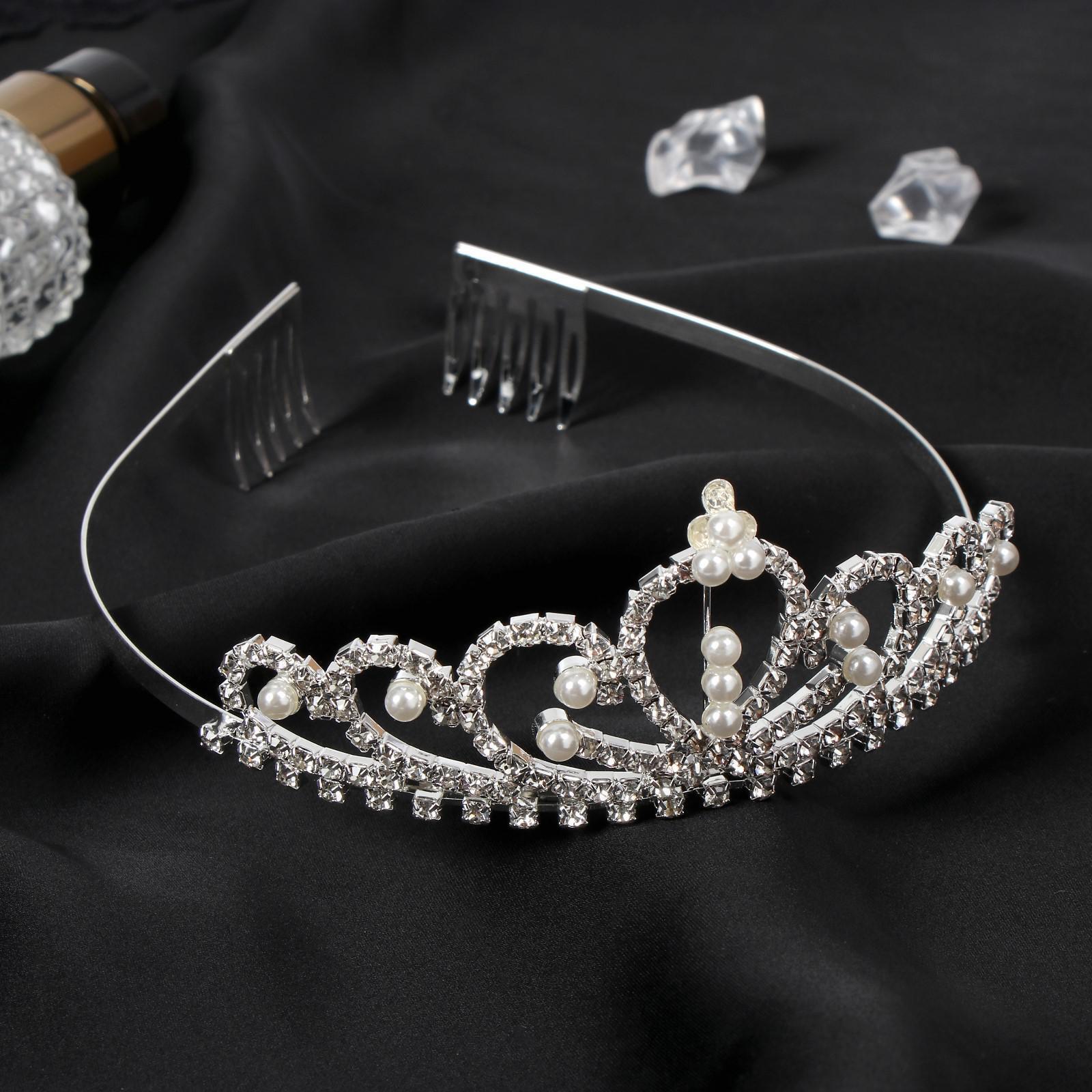 Диадема для волос "Аделина" корона жемчуг, 5 см, серебро