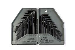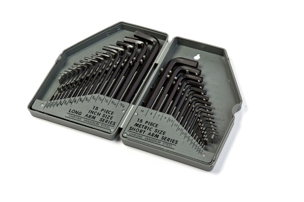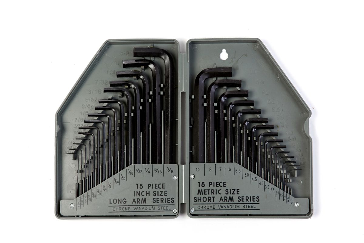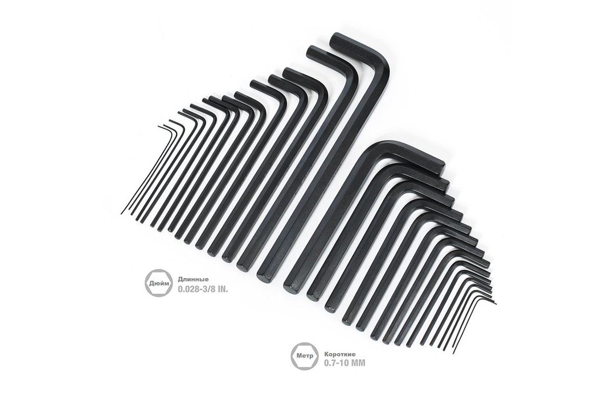 Набор включает в себя: 15 шт . длинных ключей с размерами обозначенными в дюймах: 0.028'', 0.035'', 0.050'', 1/16'', 5/64'', 3/32'', 7/64'', 1/8'', 9/64'', 5/32'', 3/16'', 7/32'', 1/4'', 5/16'', 3/8'' 15 шт. коротких ключей с размерами обозначенными в мм. : 0.7, 0.9, 1.3, 1.5, 2.0, 2.5, 3.0, 4.0, 4.5, 5.0, 5.5, 6.0, 7.0, 8.0, 10.0.