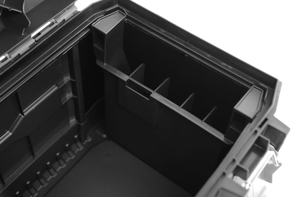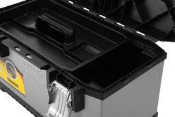 STANLEY FatMax 1-95-615 – профессиональный ящик для хранения и транспортировки ручного инструмента. Отличается жёсткой и прочной конструкцией из металлопластика, устойчивого к механическим и термическим повреждениям. Верхний лоток снимается, в нём можно размещать мелкие детали и крепёж.