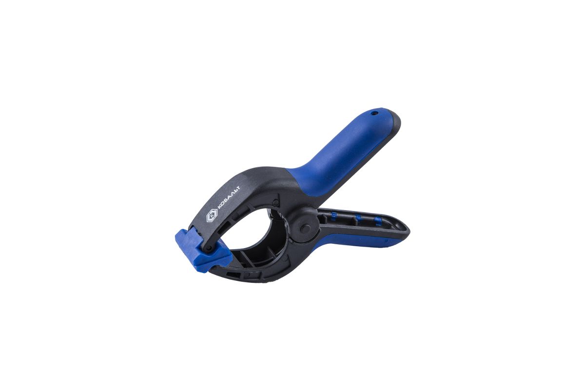 Зажим ручной пружинный 150мм КОБАЛЬТ 244-773 предназначен для временной фиксации деталей при склейке с постоянным усилием. Изготовлен из пластика армированного стекловолокном с пружиной кручения в шарнире. Самоориентирующиеся пластиковые губки облегчают установку зажима и не оставляют следов на заготовке. Коническая прорезь в губках для фиксации цилиндрических заготовок. Обрезиненные рукоятки уменьшают скольжение и повышают комфортность работы. Глубина захвата, 58мм, толщина фиксируемых деталей до 70мм, ширина губок 30мм, усилие сжатия 13кгс.