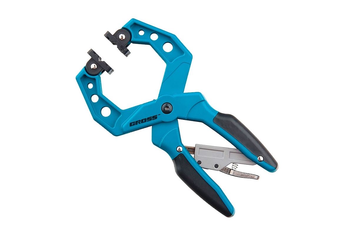 Струбцина клещеобразная торговой марки GROSS предназначена для фиксации и удержания деталей и заготовок различных конструкций диаметром до 100 мм. Прижимные накладки на шарнирах позволяют размещать деталь под разными углами. Храповой механизм обеспечивает надежную и жесткую фиксацию заготовок/деталей в отличие от механизма пружинных струбцин прищепочного типа. При нажатии на курок происходит мгновенное раскрытие струбцины. Двухкомпонентная рукоятка позволяет комфортно удерживать инструмент в руке при эксплуатации.