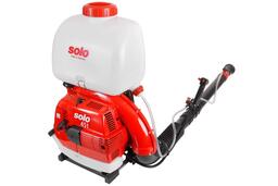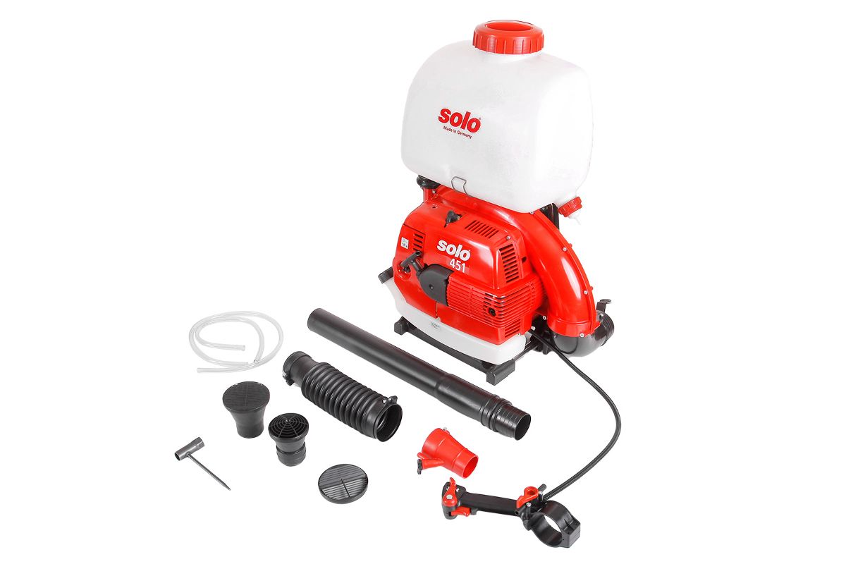 SOLO 451-02 (20L) — бензиновый опрыскиватель, предназначен для использования в сельском хозяйстве, на плантациях, во время тушения пожара. При помощи специальных насадок способен распылять сухие смеси. Ранцевая система позволяет перемещать опрыскиватель на спине во время его использования. Мощность — 3 л.с. Объем бака — 20 л. Производительность — 1400 м³/час.