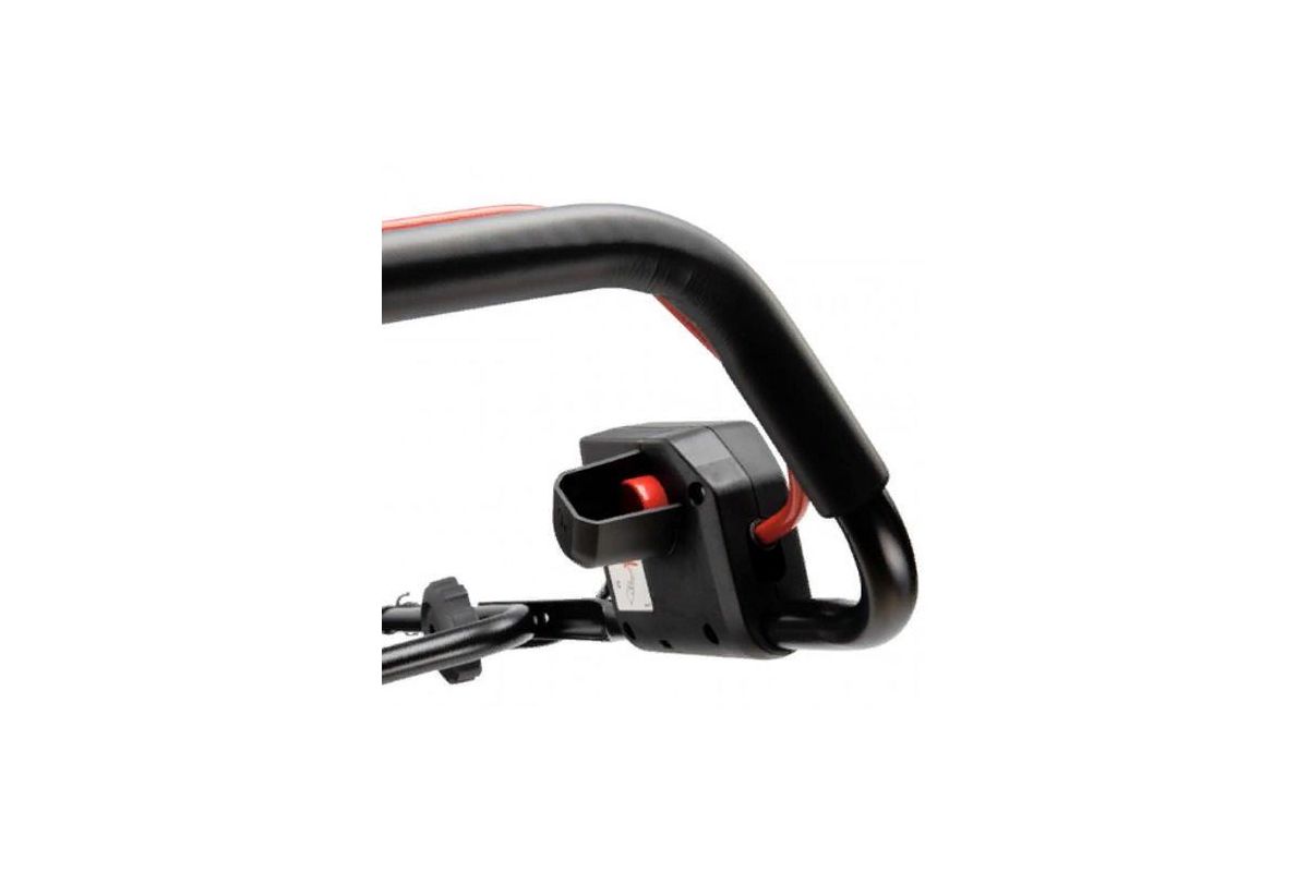 - Удобная в работе ручка с мягкими накладками регулируется по высоте. На время хранения ее и вовсе можно сложит, благодаря чему косилка очень компактна и не занимает много места.