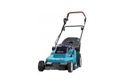 - Рабочее напряжение для данной модели составляет 36В и обеспечивается двумя Li-Ion аккумуляторами с напряжением 18В каждый. Это позволяет обрабатывать участки площадью до 9-ти соток. Ширина захвата - 43 см;