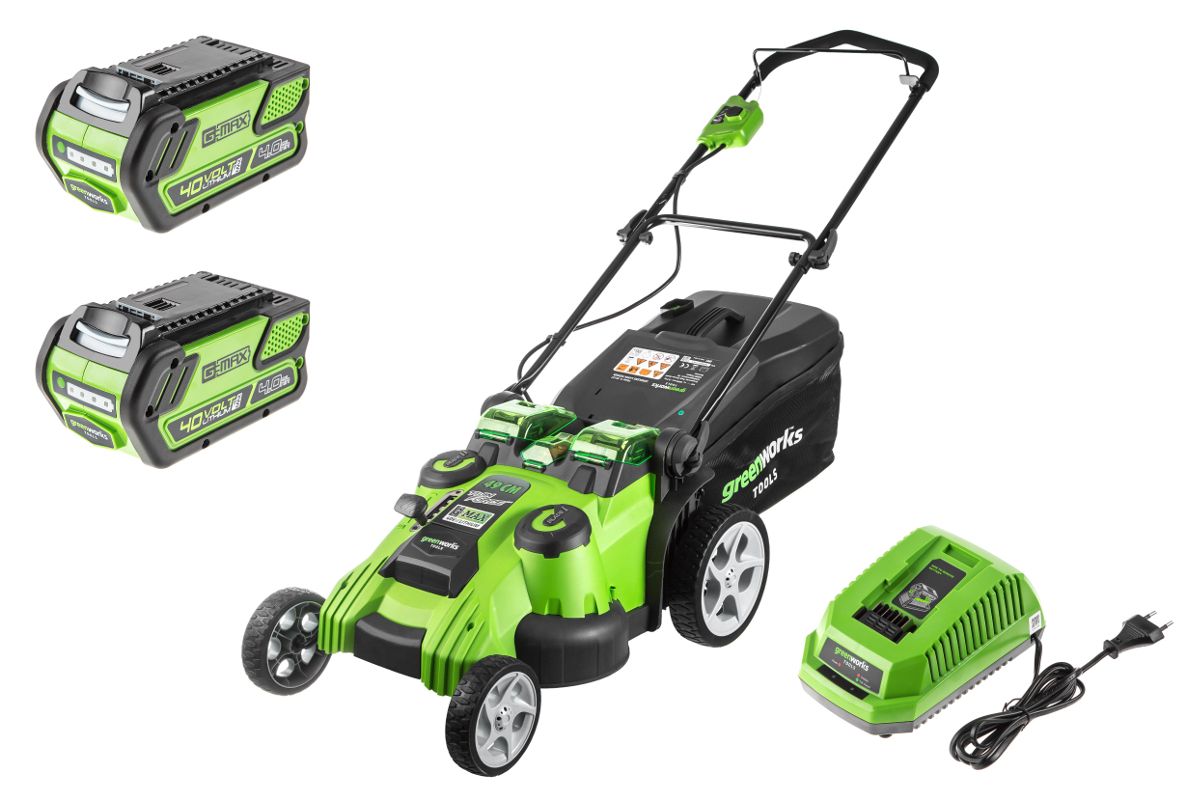 Аккумуляторная газонокосилка GREENWORKS G40LM49DB работает на двух литий-ионных батареях с напряжением 40 В. Оборудована двумя ножами. На одном заряде скашивает до 400 м².