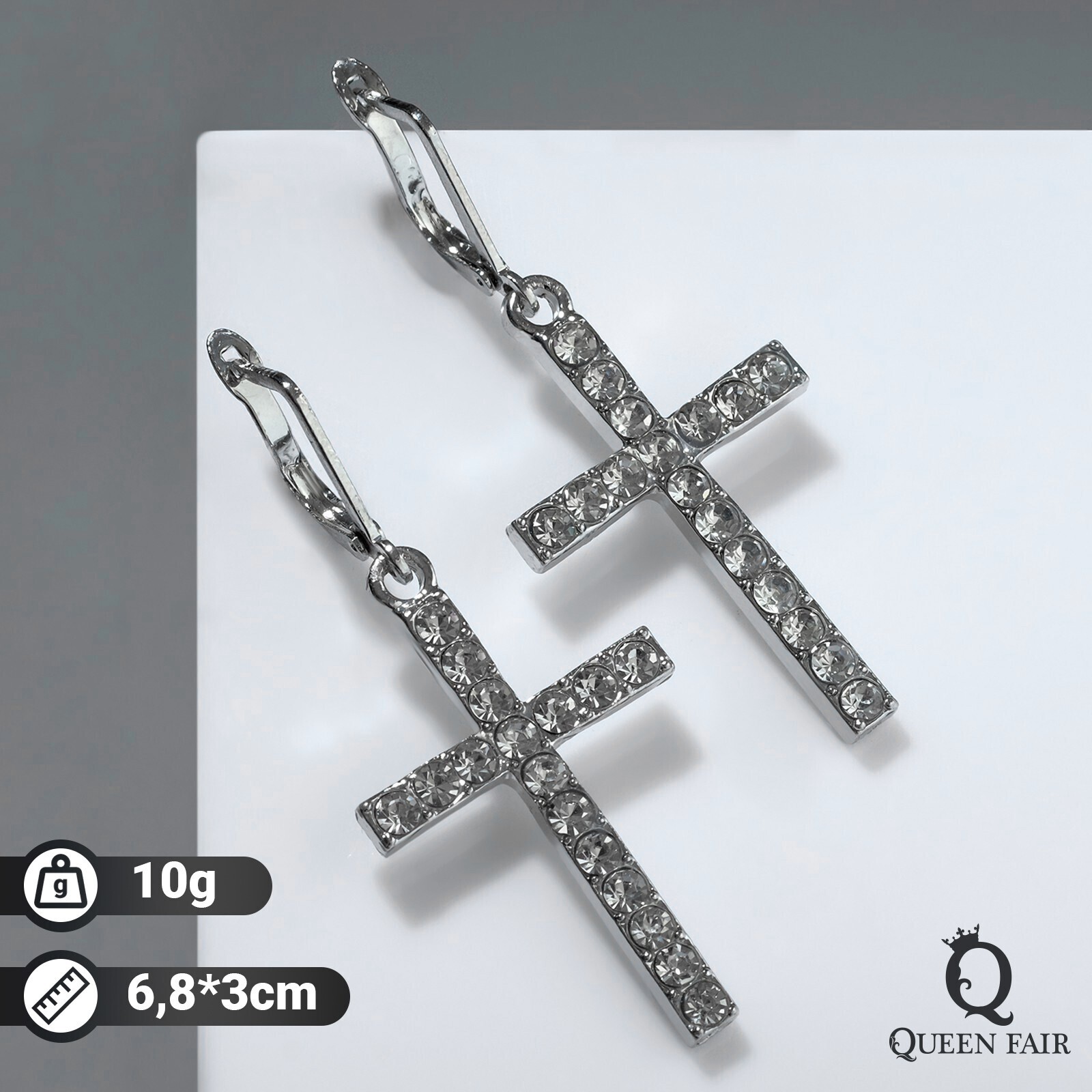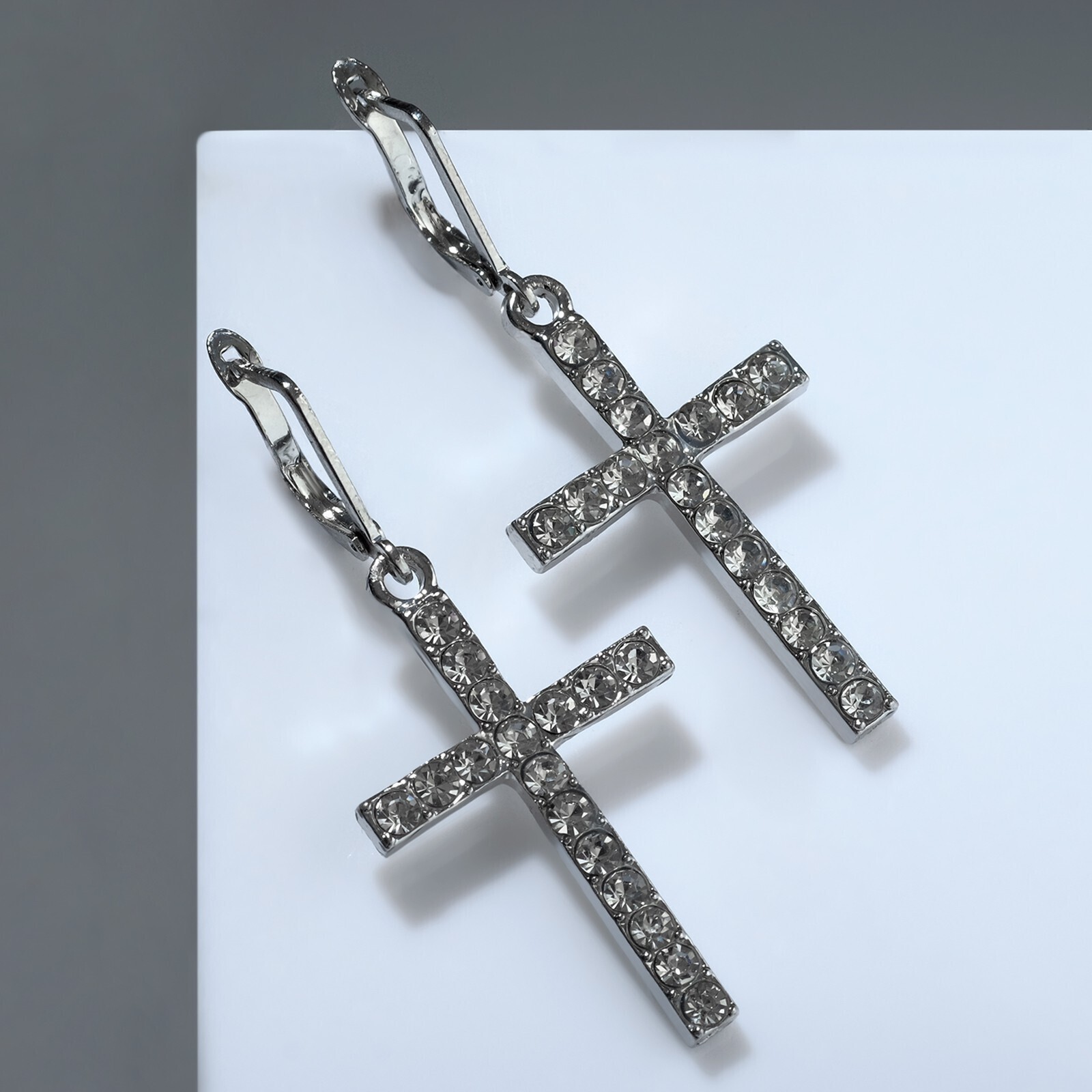 Серьги висячие со стразами "Крестики" классика удлинённые, цвет белый в серебре