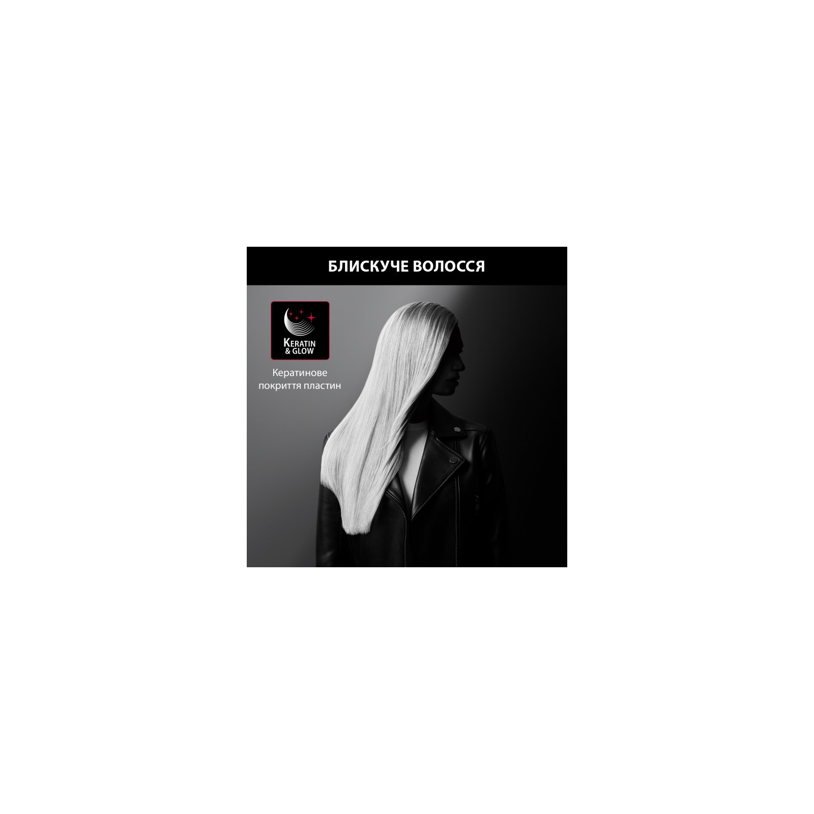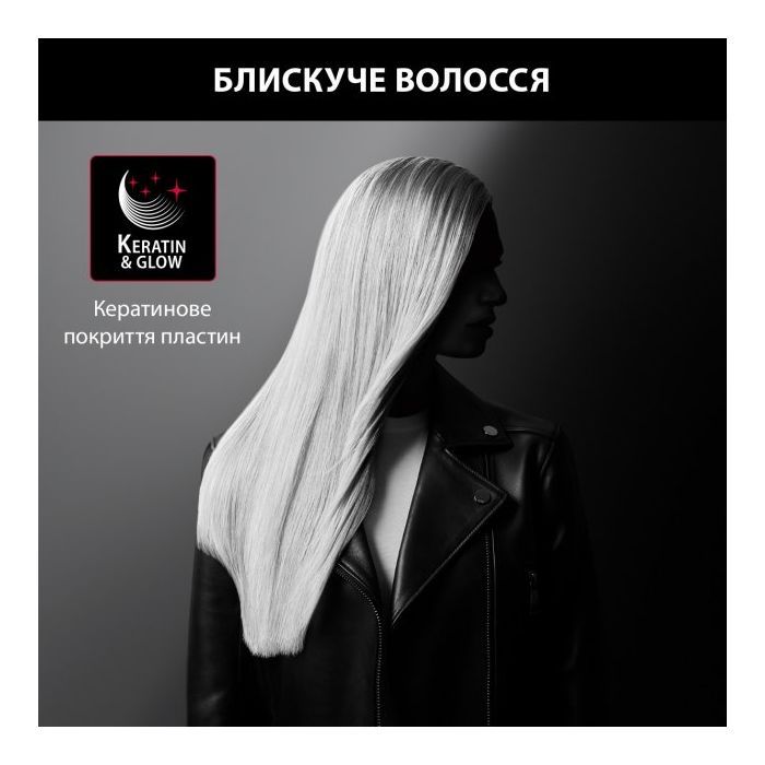 Наше ексклюзивне покриття Keratin & Glow поєднує в собі пробілковий кератин і мінеральний турмалін, що випромінює іони, щоб зменшити пухнастість і зробити волосся дуже гладким і сяючим.