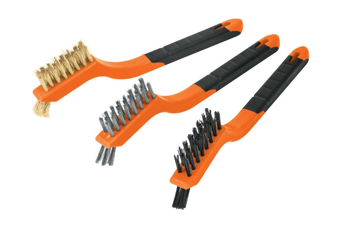 Набор щеток 3шт, латунная щетка- калибр 0,15 мм, нержавеющая сталь- калибр 0,15 мм, нейлон- калибр 0,5 мм. Щетина на верхней части для работы в труднодоступных местах, удобная двухкомпонентная ручка