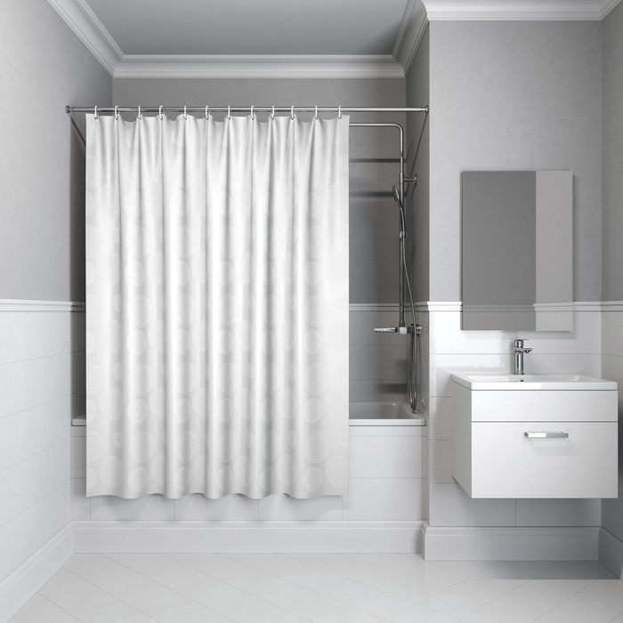 Непрозрачная светлая штора для ванной в классическом стиле с матовым геометрическим принтом в виде кругов. Штора изготовлена из полиэстера с красивой атласной текстурой и деликатным блеском. Штора имеет прозрачные пластиковые люверсы; без колец в комплекте. Непрозрачная светлая штора для ванной в классическом стиле с матовым геометрическим принтом в виде кругов. Штора изготовлена из полиэстера с красивой атласной текстурой и деликатным блеском. Штора имеет прозрачные пластиковые люверсы; без колец в комплекте.