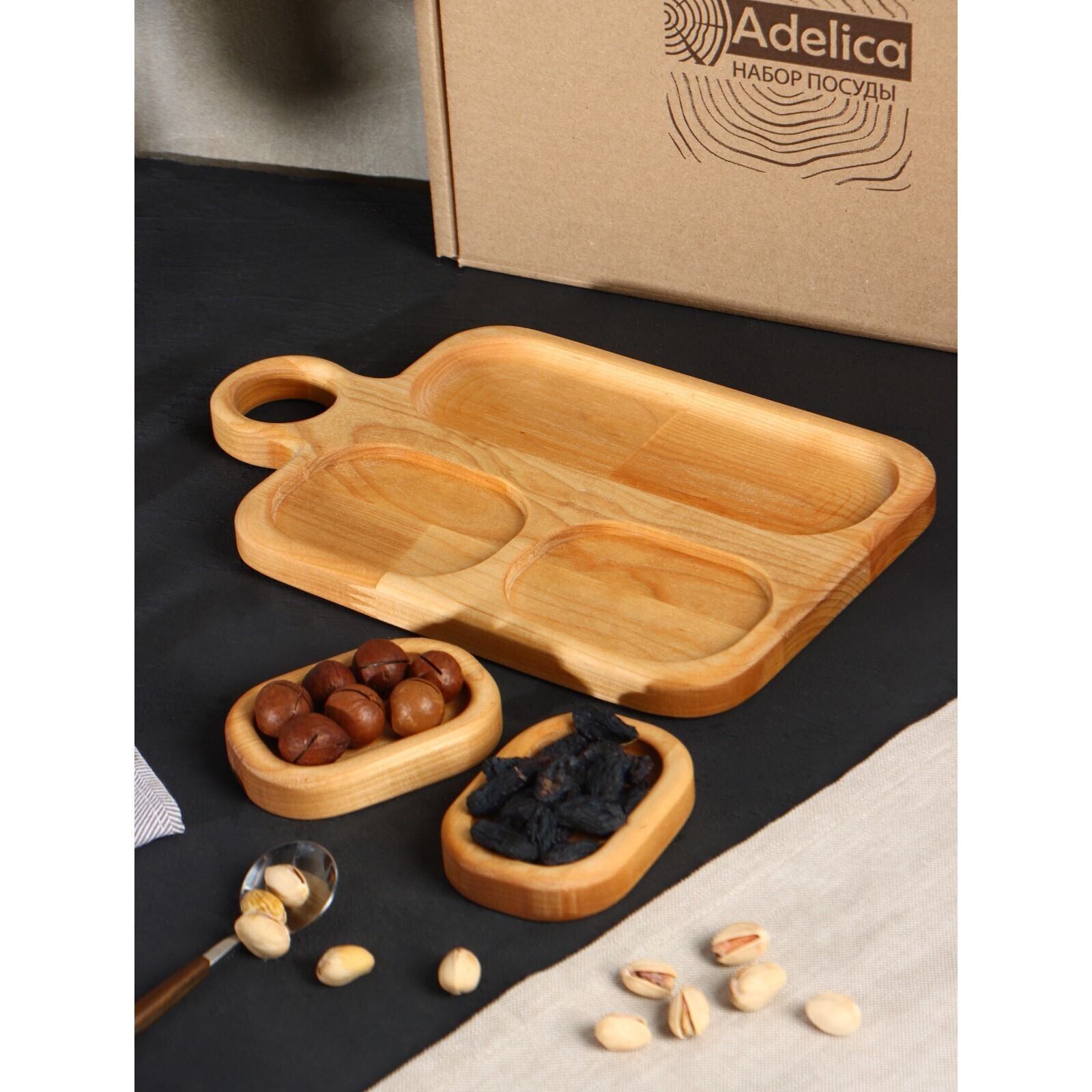 Подарочный набор посуды Adelica, доска сервировочная 3 секции, 2 менажницы сьемные, масло в подарок 100 мл