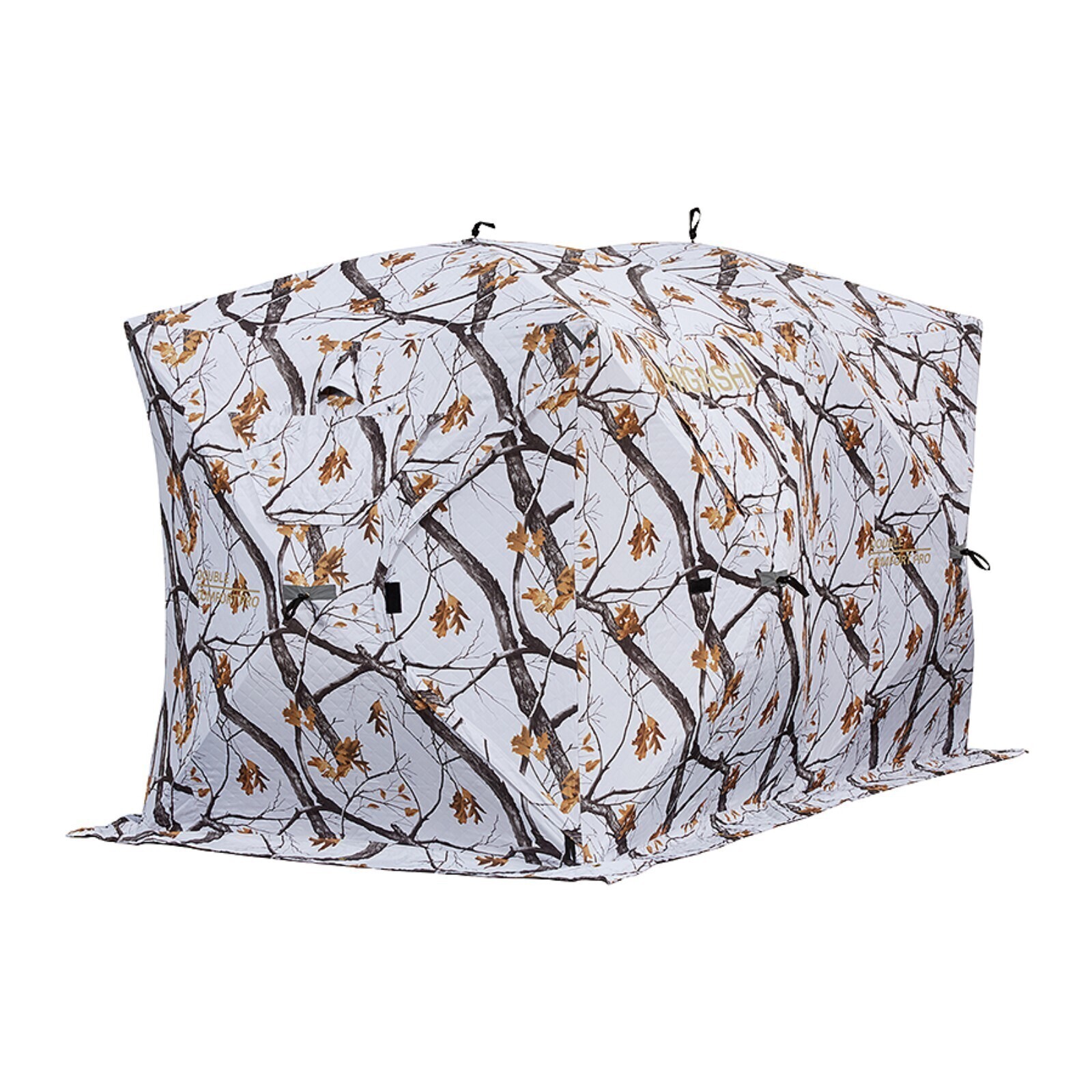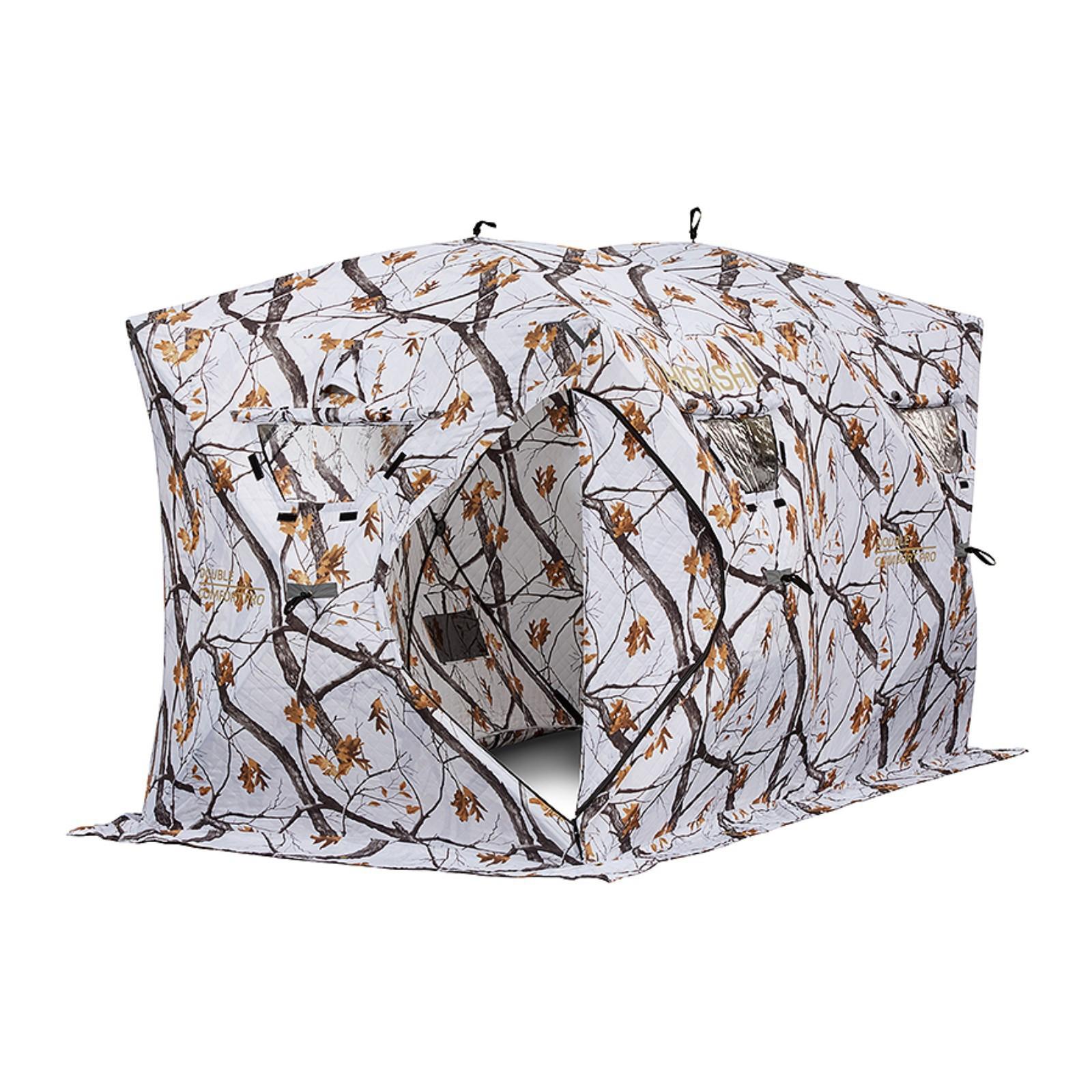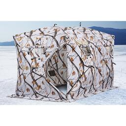 Сдвоенная утепленная зимняя палатка традиционной кубовидной формы выполненная в зимнем камуфляже.