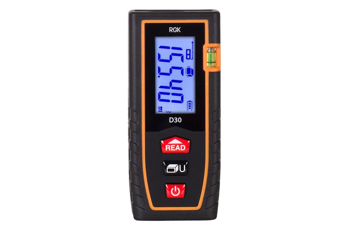 Лазерный дальномер RGK D30 — один из самых компактных инструментов, представленных на рынке. Он позволит выполнить разметочные работы точно и буквально за несколько минут. Отличается простым управлением, экраном с подсветкой и удобной клавиатурой. Среди особенностей возможность вычислений по теореме Пифагора, определение максимальных и минимальных значений. Дальность действия — до 30 м. Питается от двух батареек типа ААА.
