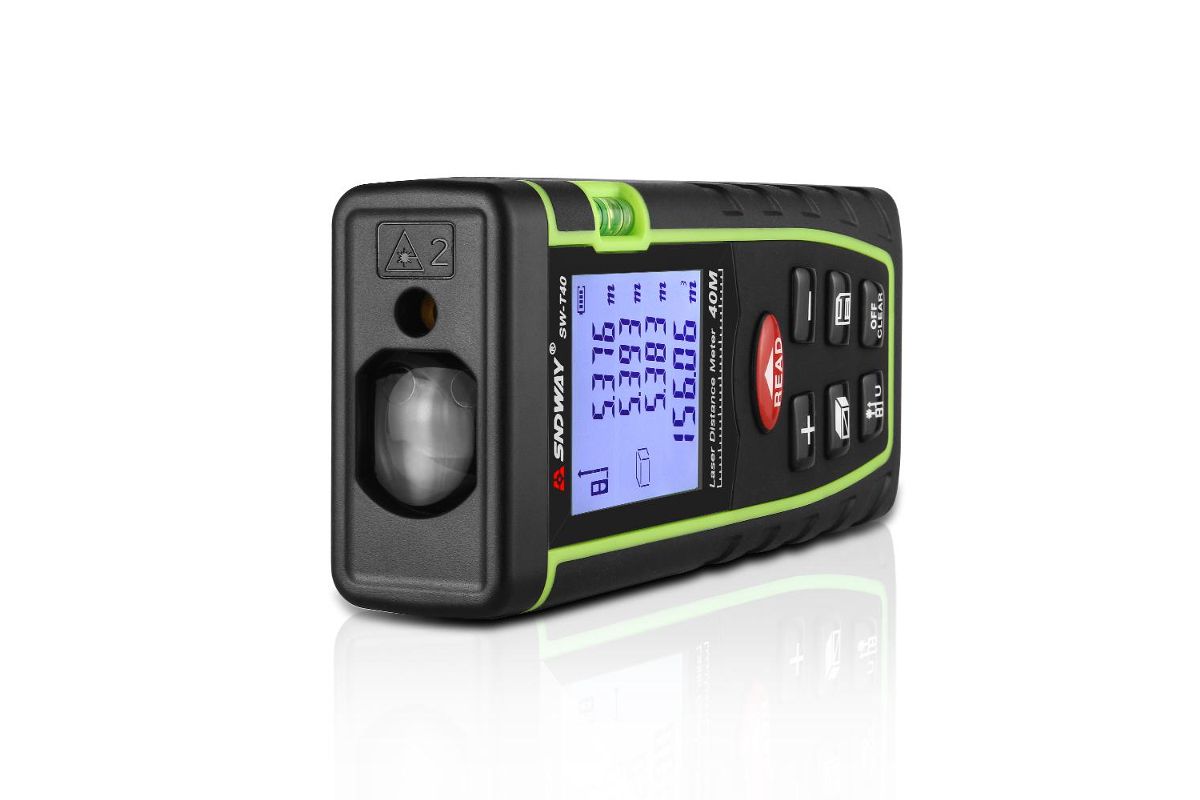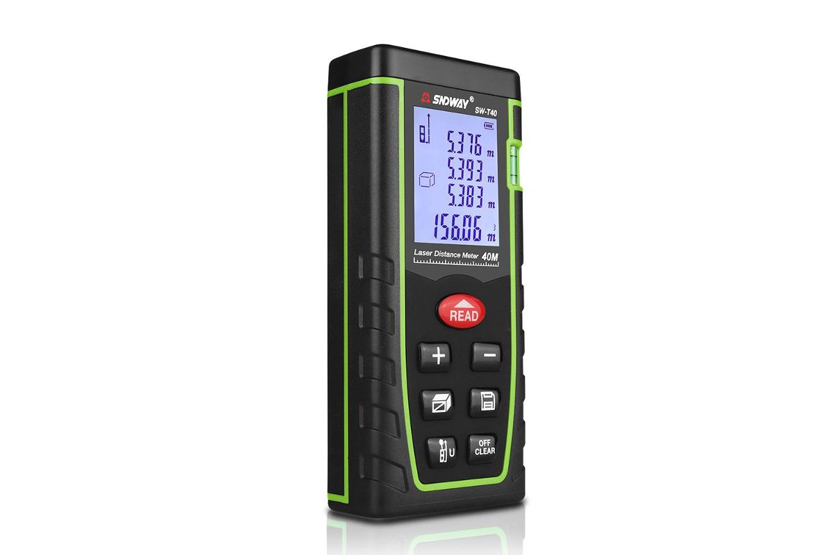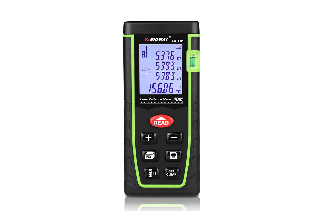 Лазерный дальномер SNDWAY SW-T40 - тип: лазерный, дальность измерения (без отражателя): 40 м, минимальное расстояние измерений: 5 см, точность измерения: 2 мм, количество точек начала отсчета: 2, количество сохраняемых замеров: 30, подсветка дисплея, звуковая индикация, автоотключение, Функция Пифагора, функция сложения/вычитания, функция расчета объема, функция непрерывного измерения, функция расчета площади, функция определения максимальных и минимальных значений, встроенная память, тип электропитания: батарейки, количество батареек: 2, класс защиты: IP54, класс лазера: 2, длина волны: 635 нм, вес: 110 г.