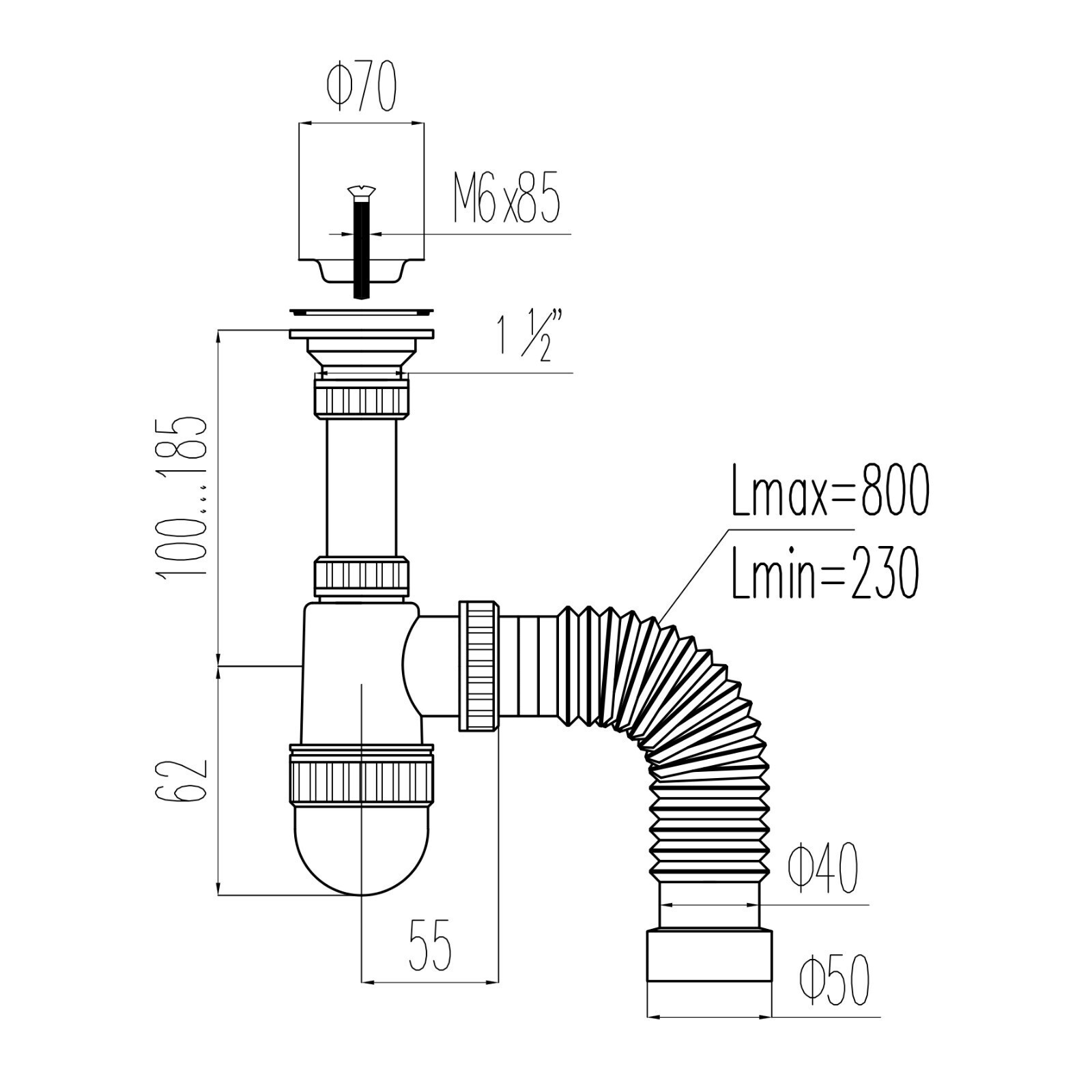 Сифон для раковины VIANT «ПРОФИ» 1½"- d=40 мм, решетка d=70 мм, c гофрой d=40