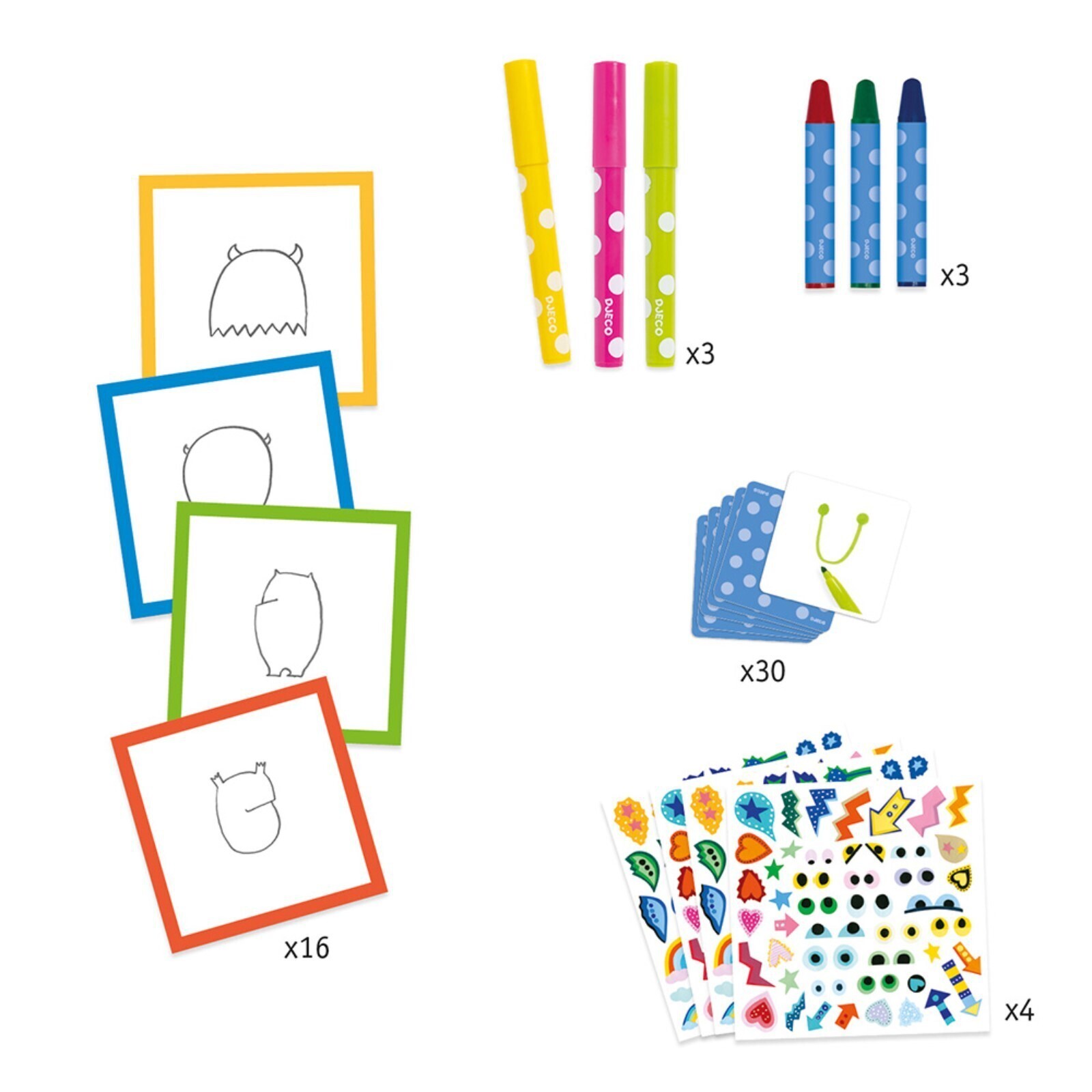 Набор для рисования «Маленькие монстрики» от французского производителя игрушек Djeco (Джеко) — это коробочка со всем необходимым для детского творчества. Малышу предстоит дорисовать монстриков на специальных карточках и украсить получившиеся иллюстрации наклейками и прочим декором. Набор помогает развить навыки мелкой моторики и творческие способности. Подойдёт для детей от 2 лет.