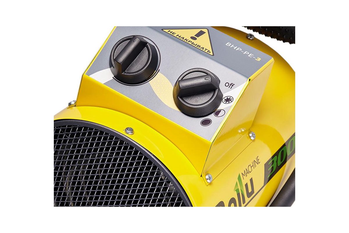 BALLU BHP-PE-3 – электрическая тепловая пушка для использования в помещении. Мощности ТЭН в 3000 Вт достаточно для обогрева до 35 м². Пригодится для отопления комнат, подсобок, мастерских и т.д.