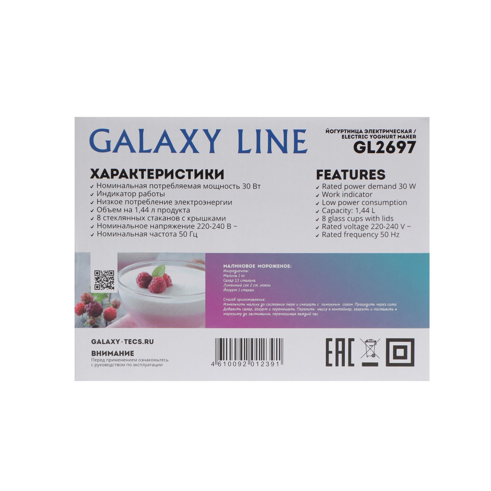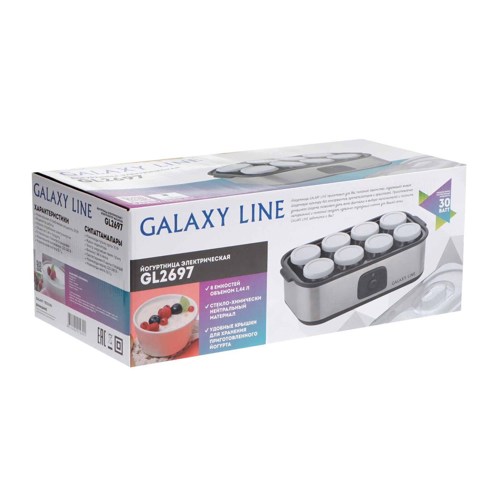 Йогуртница Galaxy GL 2697, 30 Вт, 180 мл, 8 ёмкостей, стекло, серебристая