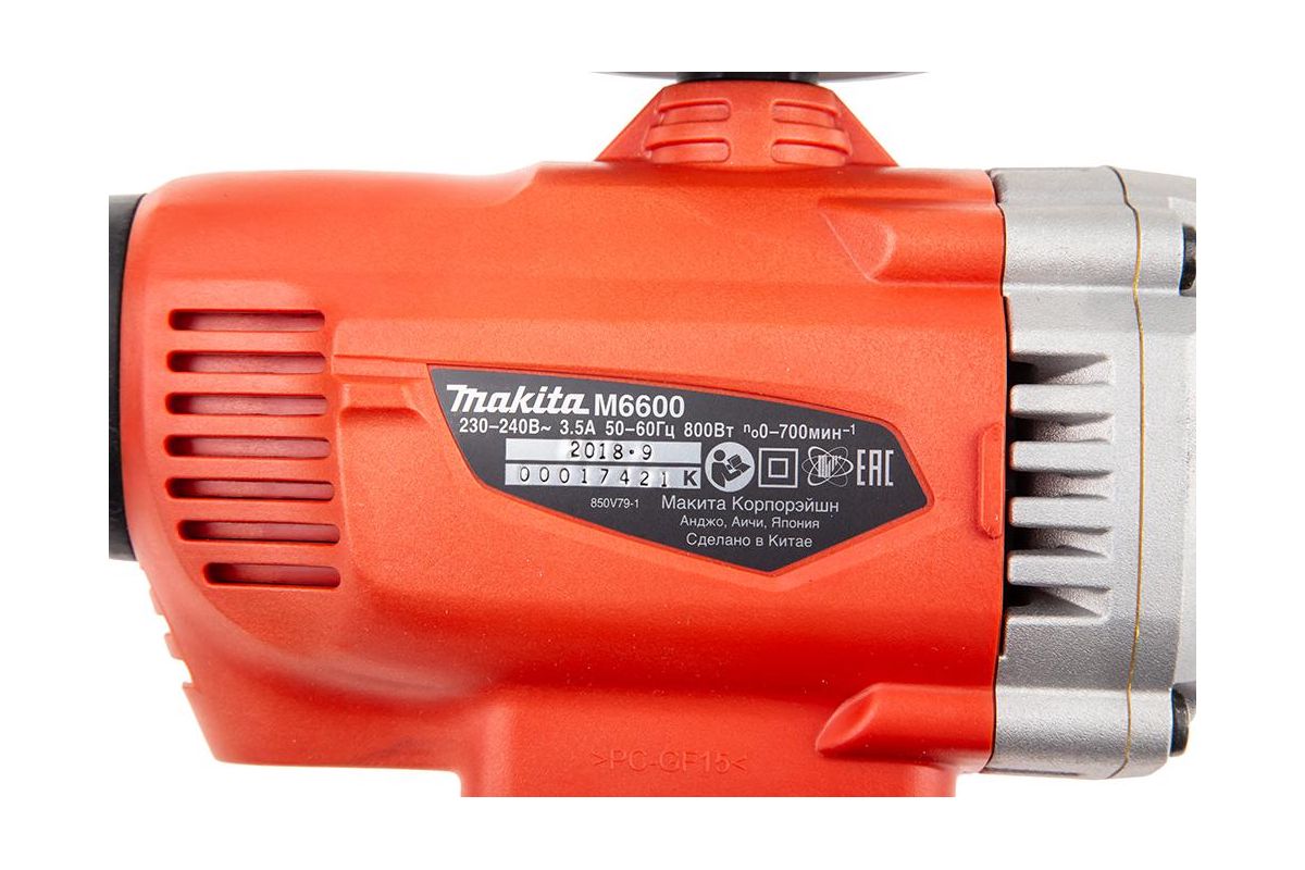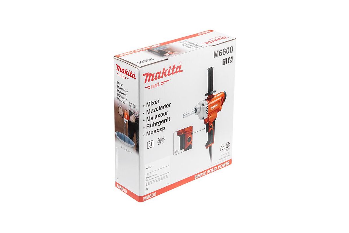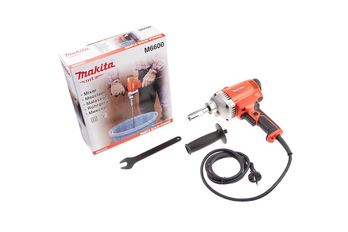 Makita M6600 - дрель-миксер для смешивания строительных смесей и высверливания отверстий в дереве и металле при условии покупки переходника и патрона. Может использоваться с венчиками до 165 мм с резьбой M12 или M14 (в зависимости от страны). Мощность 800 Вт. Обороты 700 об/мин.