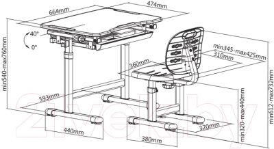 • Регулировка наклон столешницы, высота столешницы, высота стула, глубина спинки стула