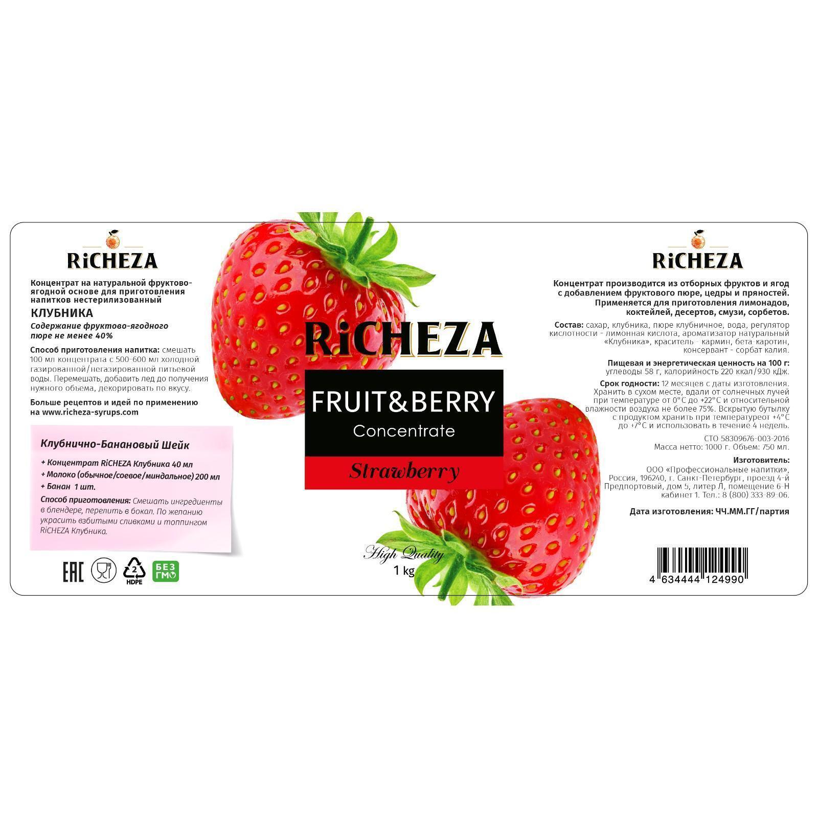 Клубника – одна из самых любимых и востребованных ягод. Благодаря бережной переработке ягод концентрат RiCHEZA «Клубника» идеально сохраняет текстуру, сочный вкус, яркий аромат и насыщенный цвет свежесобранной клубники! Содержание фруктово-ягодного пюре не менеё 40 %.
