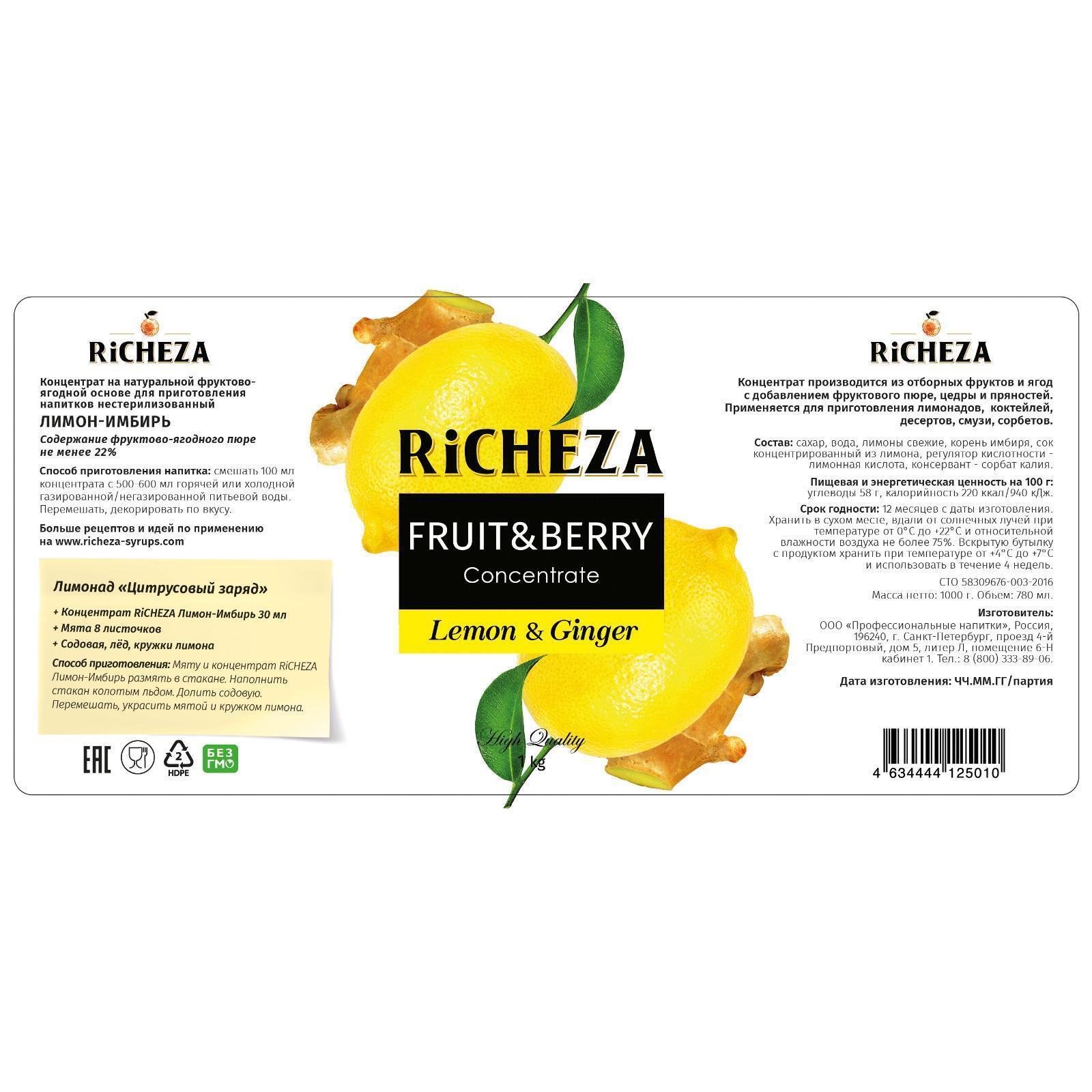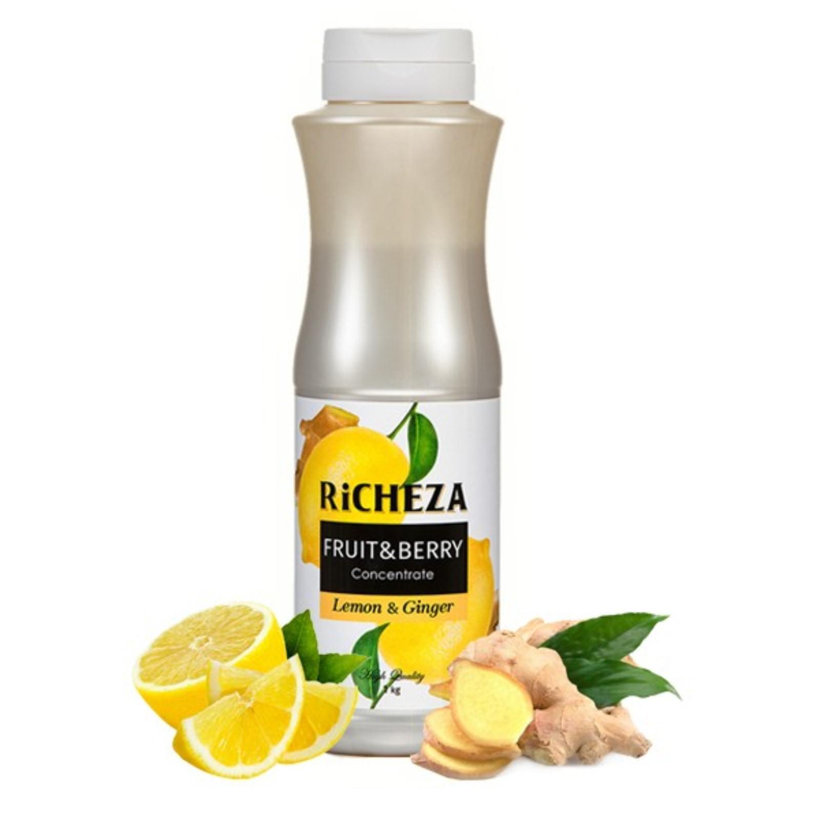 Концентрат RiCHEZA «Лимон-Имбирь» подходит для приготовления как холодных, так и горячих напитков. Для приготовления концентрата используют свежие лимоны и измельченный корень имбиря. Содержание фруктово-ягодного пюре не менеё 25 %.
