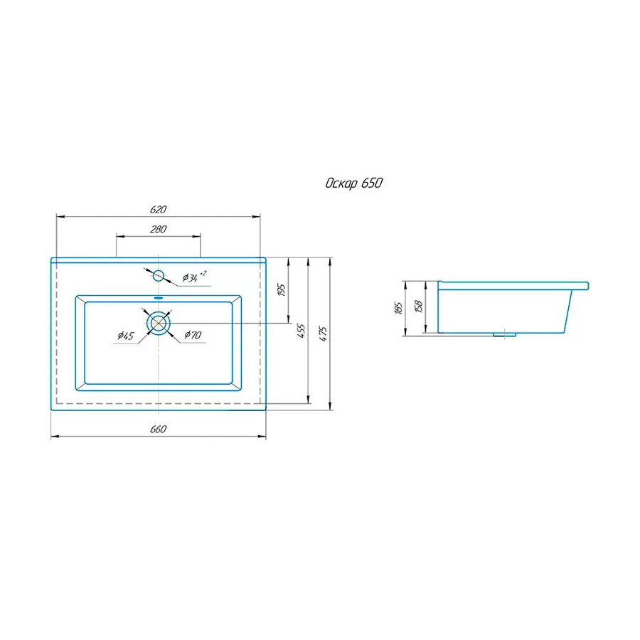 Умывальник Оскар 650, 65x47 см, настенный, санитарная керамика, крепление на стену,на мебельный шкаф