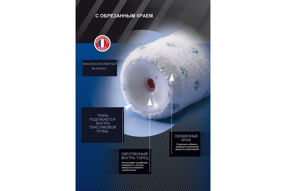 - Особая запатентованная конструкция (скошенные края и ворс ролика подгибается внутрь втулки), не оставляет лишних капель краски, разводов и увеличивает срок службы.