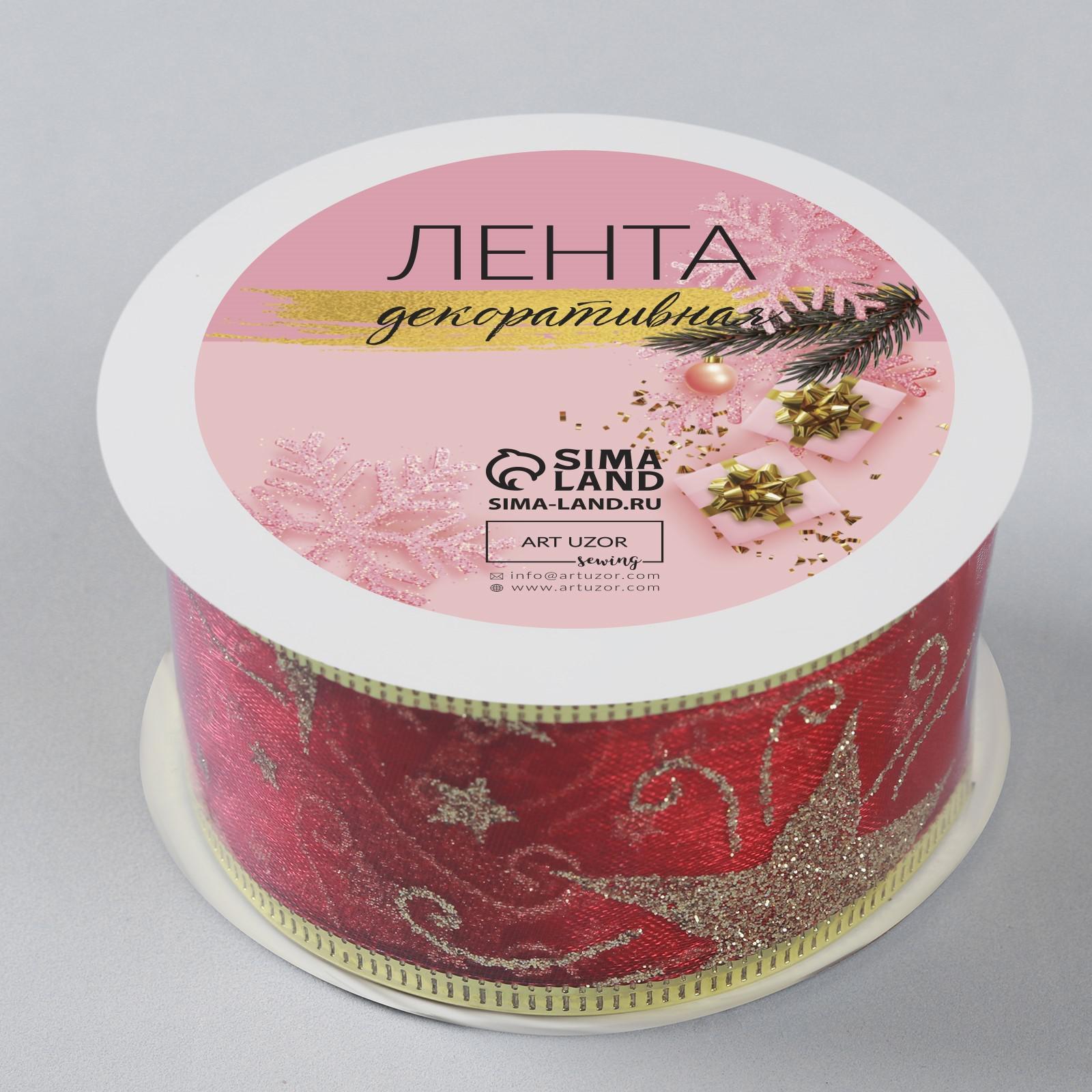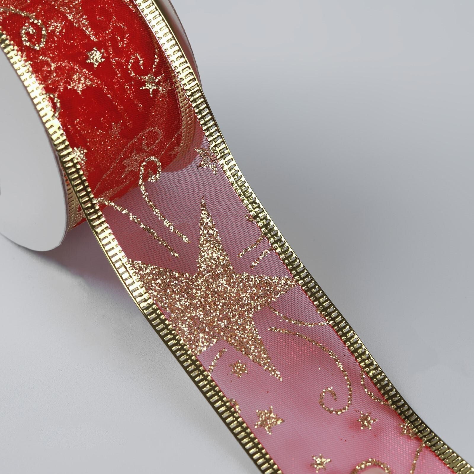 Лента капроновая с металлической нитью «Звёзды и вьюнки», 38 мм × 2,7 ± 0,5 м, цвет красный/золотой