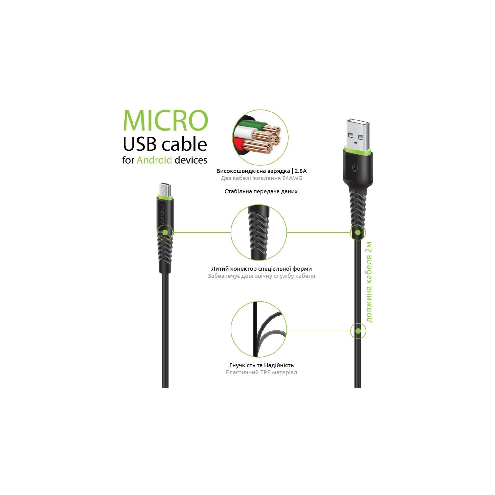 Кабель синхронізації Intaleo Micro USB - якісний і незамінний аксесуар для власників мобільних пристроїв, обладнаних Micro USB роз'ємом. Литий конектор спеціальної форми й еластичний TPE-матеріал забезпечують довголітню експлуатацію кабелю, а його пропускна здатність струму (до 2.8 А), дає змогу заряджати пристрій максимально швидко.