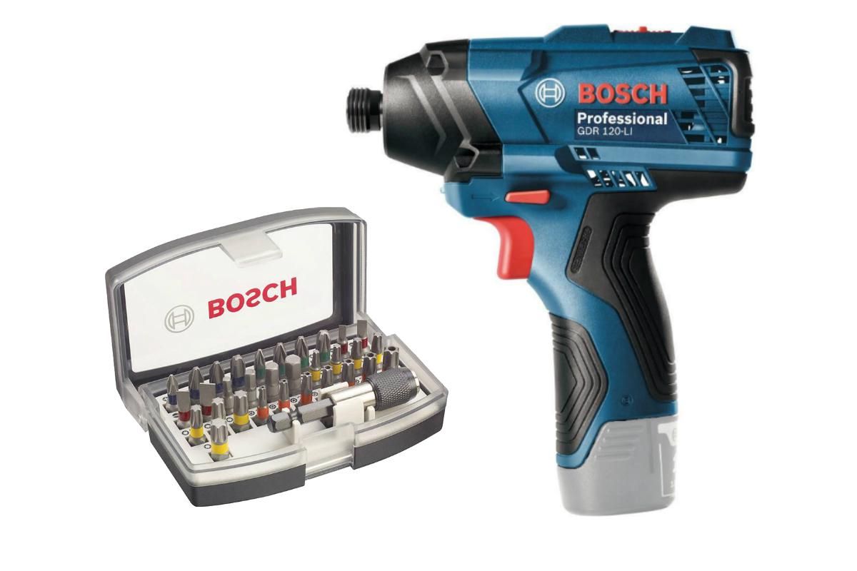 В состав набора входят: Гайковерт BOSCH GDR 120-LI (0.601.9F0.000) Импульсный. Без ЗУ и АКБ. 2600об/мин. 100 Нм. 3400 уд/ми, Набор бит BOSCH 2.607.017.319 1/4'' 25мм 32шт