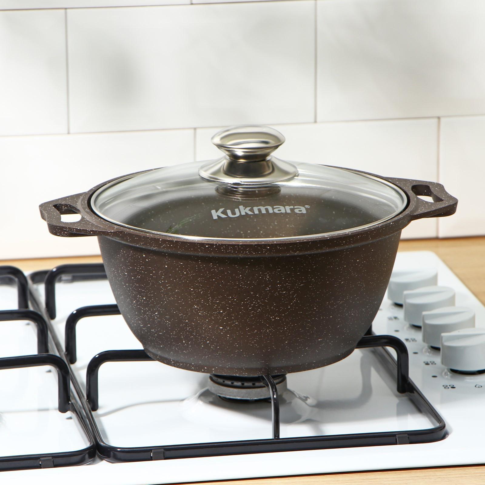 Кастрюля Kukmara сделана из литого алюминия. Имеет инновационное антипригарное мраморное покрытие на водной основе, которое изготовлено по немецкой технологии (Weilburger Coatings GmbH) и усилено сверхтвёрдыми частицами минералов.