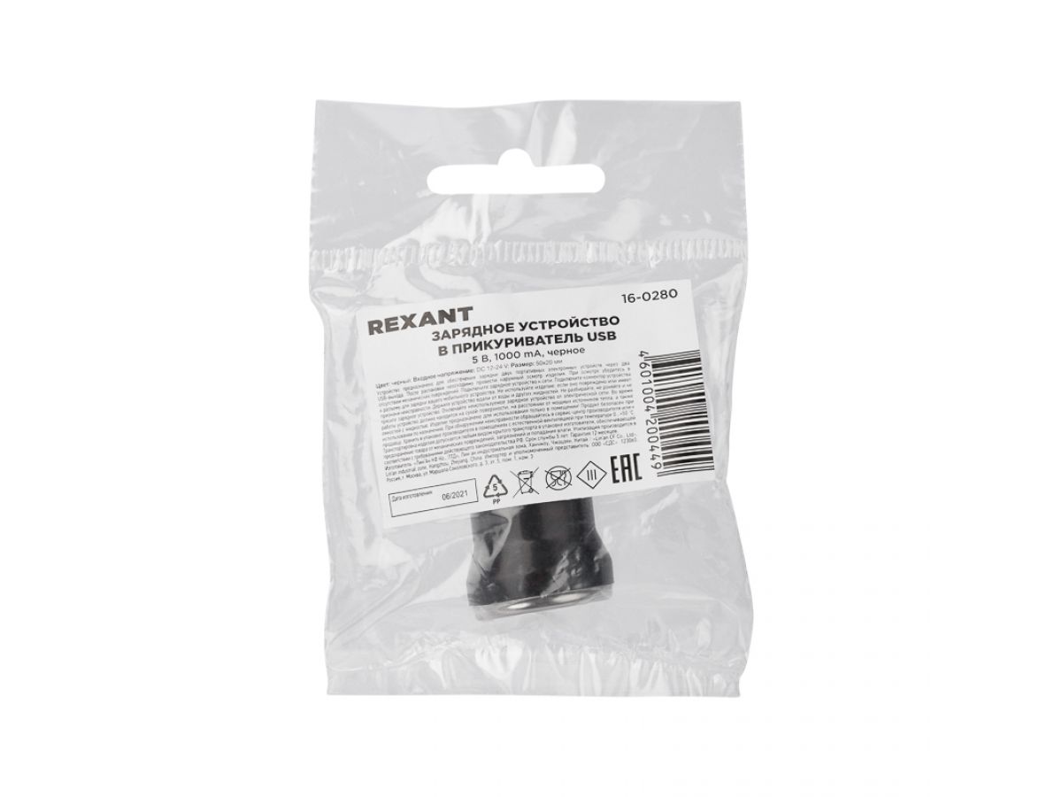 Автомобильное зарядное устройство в прикуриватель REXANT USB, 5V, 1000mA черного цвета предназначено для обеспечения зарядки портативных электронных гаджетов через USB-разъем.