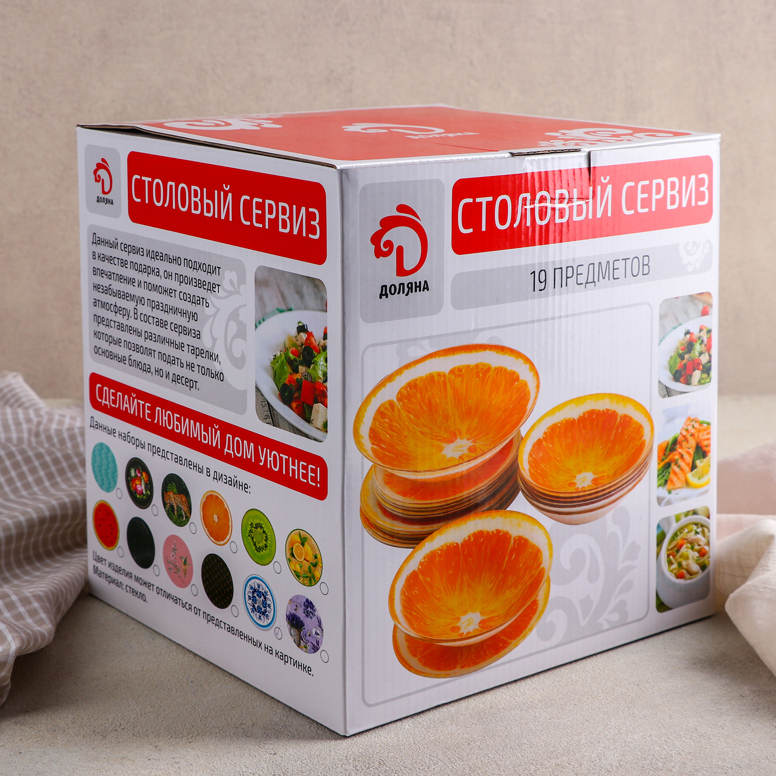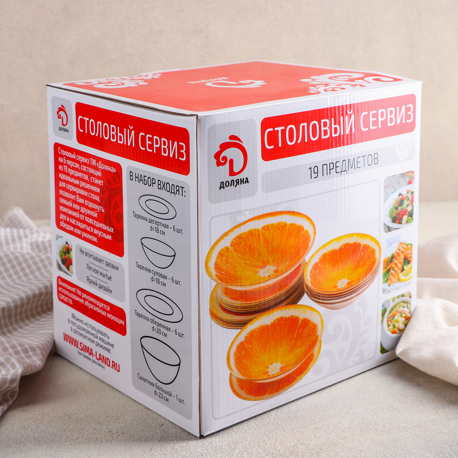 Тарелки изготовлены из качественного стекла, отличаются надежностью и долговечностью. Они не впитывают запахи и легко очищаются. Стильный дизайн позволит использовать тарелки как в повседневной сервировке, так и на праздниках и торжествах. В комплекте 19 предметов: салатник, 6 десертных тарелок, 6 обеденных тарелок, 6 мисок.