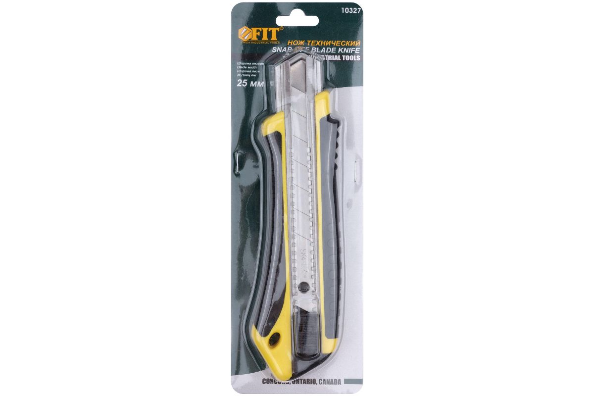 Нож FIT 10327 технический 25мм усиленный ''Отламывающиеся лезвие''. Металлическая направлющая. Материал: пластиковый прорезиненный корпус, лезвие из инструментальной стали. Упаковка: блистер.