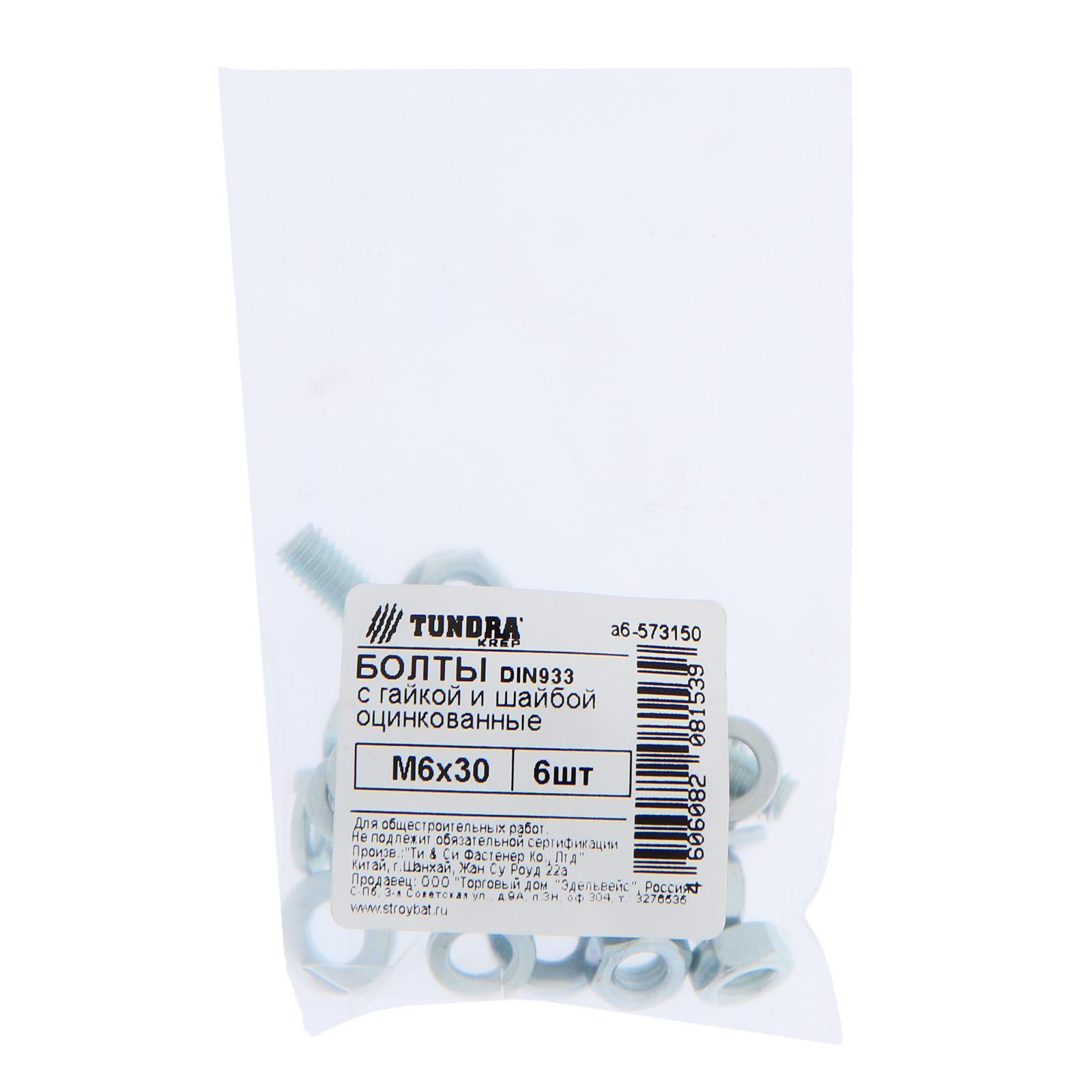 Болты ТУНДРА krep DIN933 М6x30 с гайкой и шайбой, цинк, 6 шт.