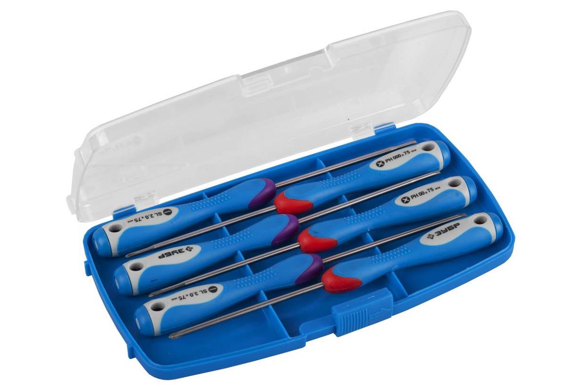 - Поставляется в удобном пластиковом боксе и включает в себя 6 отверток.