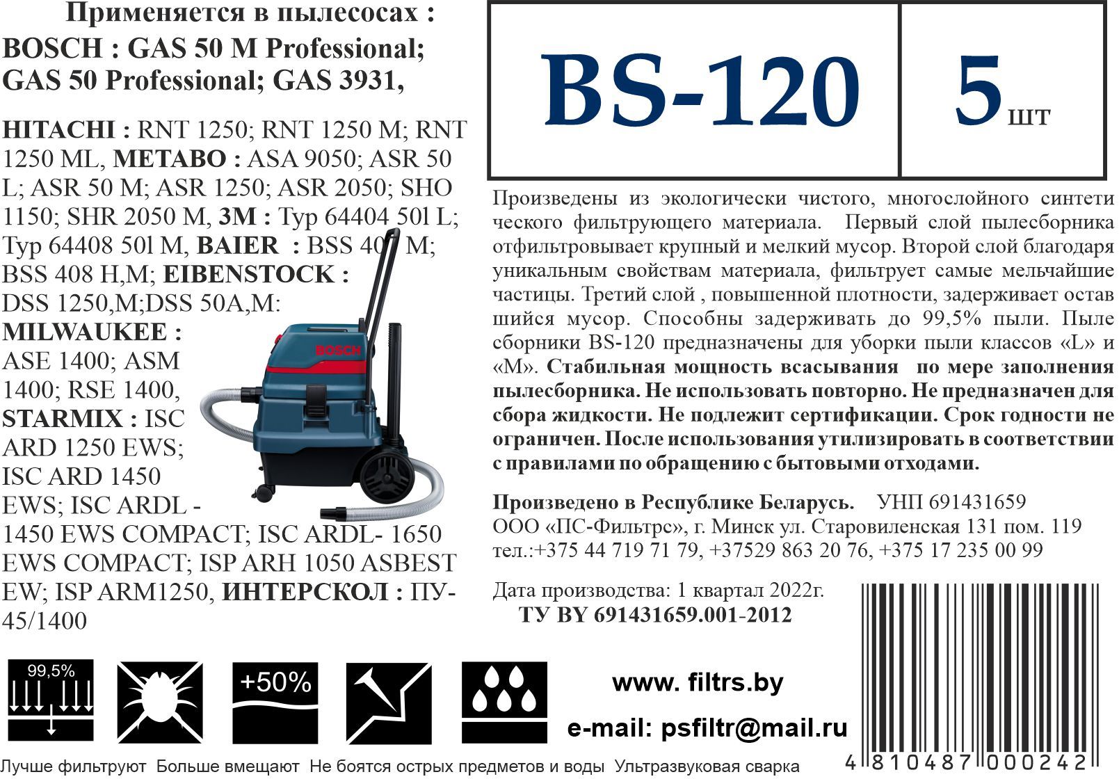 BS -120 это синтетические одноразовые пылесборники-мешки для пылесосов фирм BOSCH , HITACHI , METABO . В комплект входит 5 пылесборников .