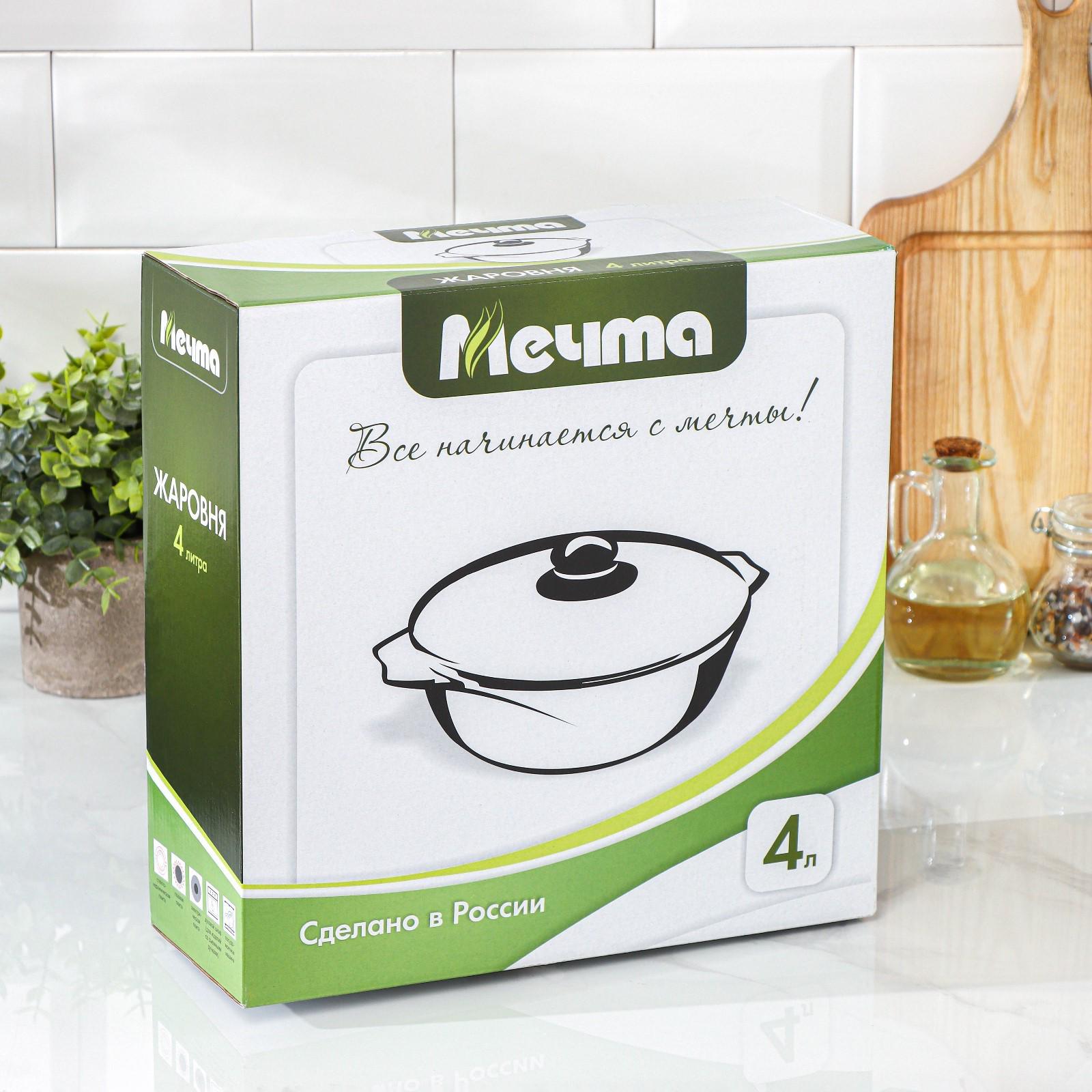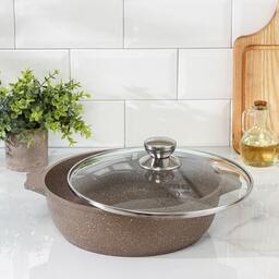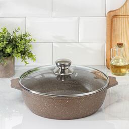 Жаровня «Гранит Brown» со стеклянной крышкой выполнена из прочного литого алюминия, имеет антипригарное покрытие. Правильное соотношение толщины дна и стенок делает посуду устойчивой к деформации и обеспечивает равномерный прогрев. В жаровне можно готовить и на плите, и в духовке.